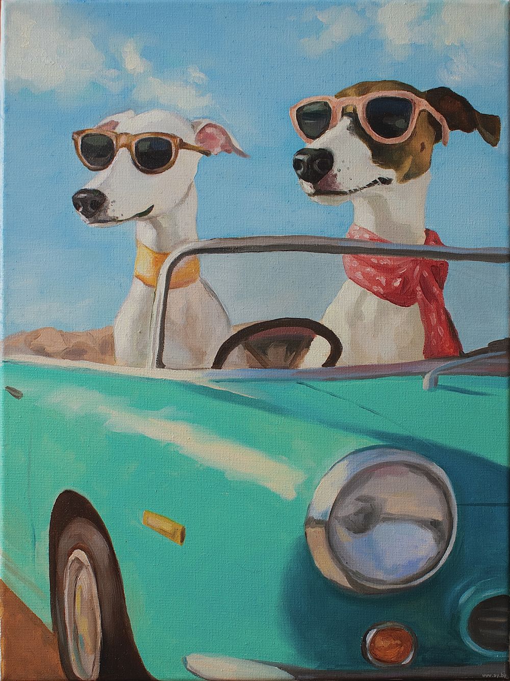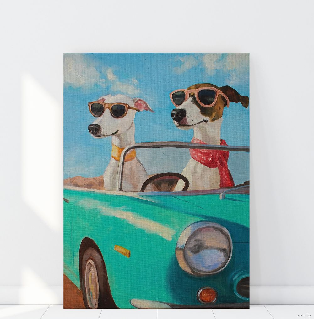 Два пса в открытом кабриолете — словно воплощение самой идеи счастья и свободы. Их солнцезащитные очки, развевающиеся шарфы и уверенные позы создают ощущение дороги в лучшие жизненные горизонты, где нет забот. Они смотрят вперёд так, будто знают: впереди их ждет множество ярких приключений.