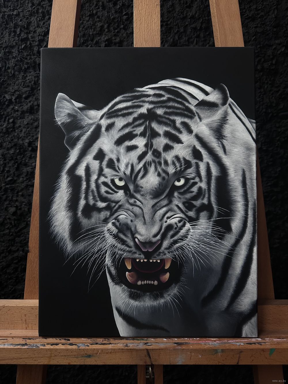 Картина написана маслом, покрыта матовым профессиональным лаком, размер 30х40, холст на подрамнике. Написана в честь тигра, что жил во дворце махараджи. Легенда гласит, что все белые тигры являются его потомками.