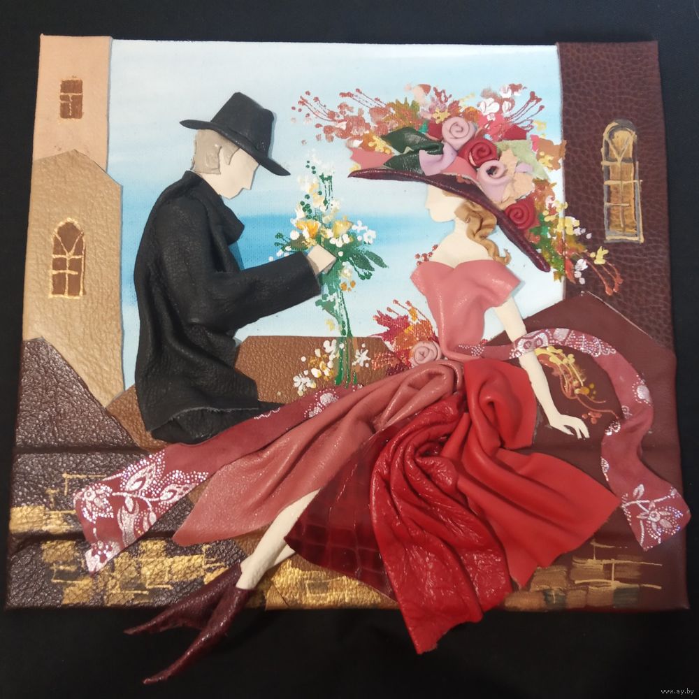 1) Картина "Романтика", оригинал. Подпись мастера Г. Нов. 2015 год. Ручная работа, hand made. Рамка и аппликация из натуральной кожи плюс рисунок красками. Влюбленная пара, любовь, кавалер и дама.Прекрасный подарок и сувенир! Цена 75р