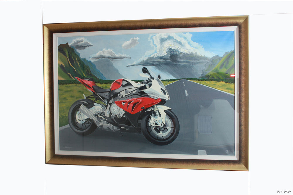 Масло холст,2015 г. Размер 80х120 см (сам холст),одет в двойной багет и закрыт оргстеклом (2мм) для лучшей защиты от пыли и влаги.Картина выставлялась на двух выставках и подойдет для украшения офиса или дома,отличный подарок для ценителей мотоциклов классических марок.Больше фото и видео при личном контакте.