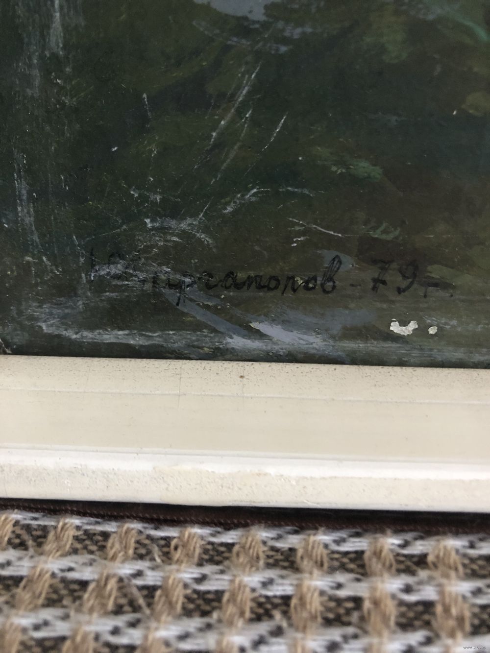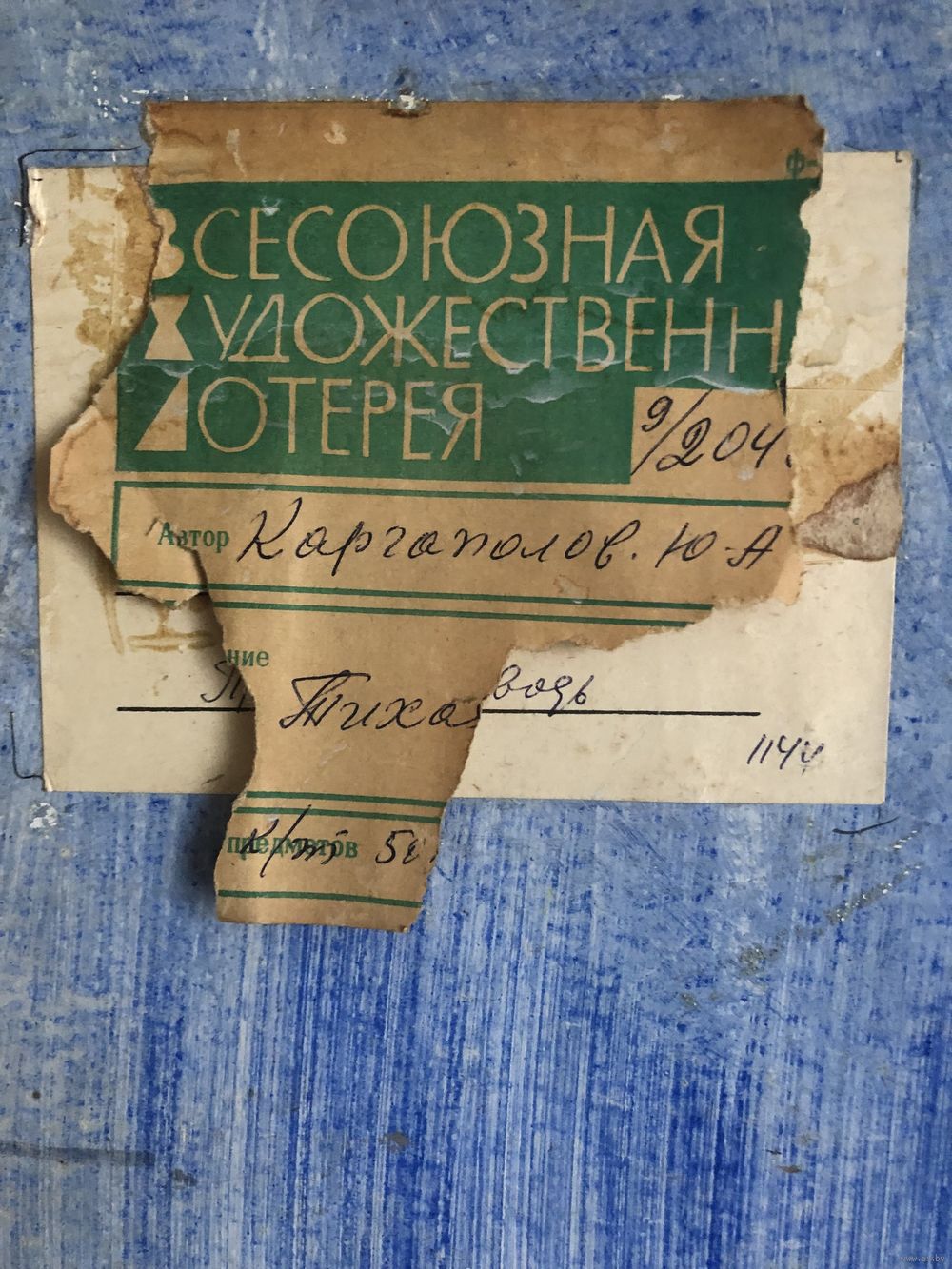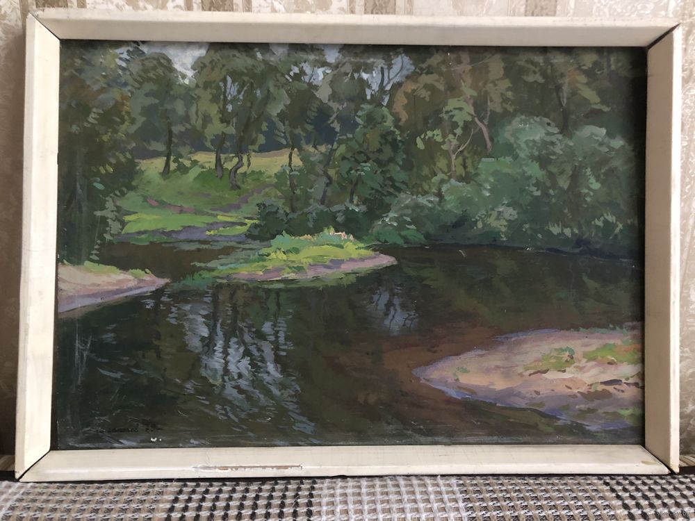 Картина Тихая заводь. Лотерейная. 1979 г. Худ. Каргаполов Ю. А. Картон, темпера. 34.5 х 50 см.