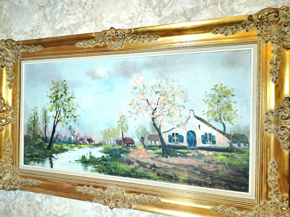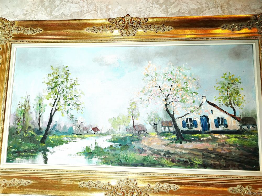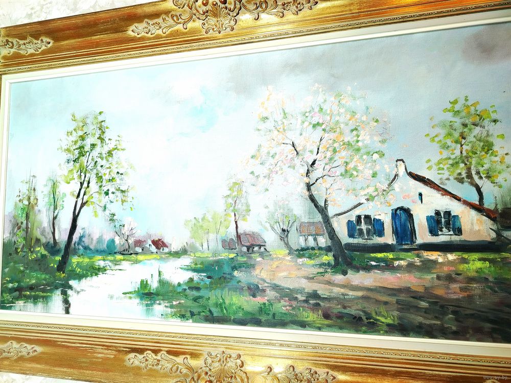 Картина в богатой раме. Европа. Холст, масло. Рама дерево и гипс. Высота 70 см ширина 120 см. Ширина рамы 12 см.