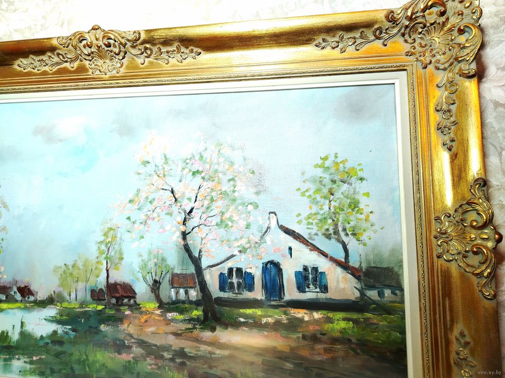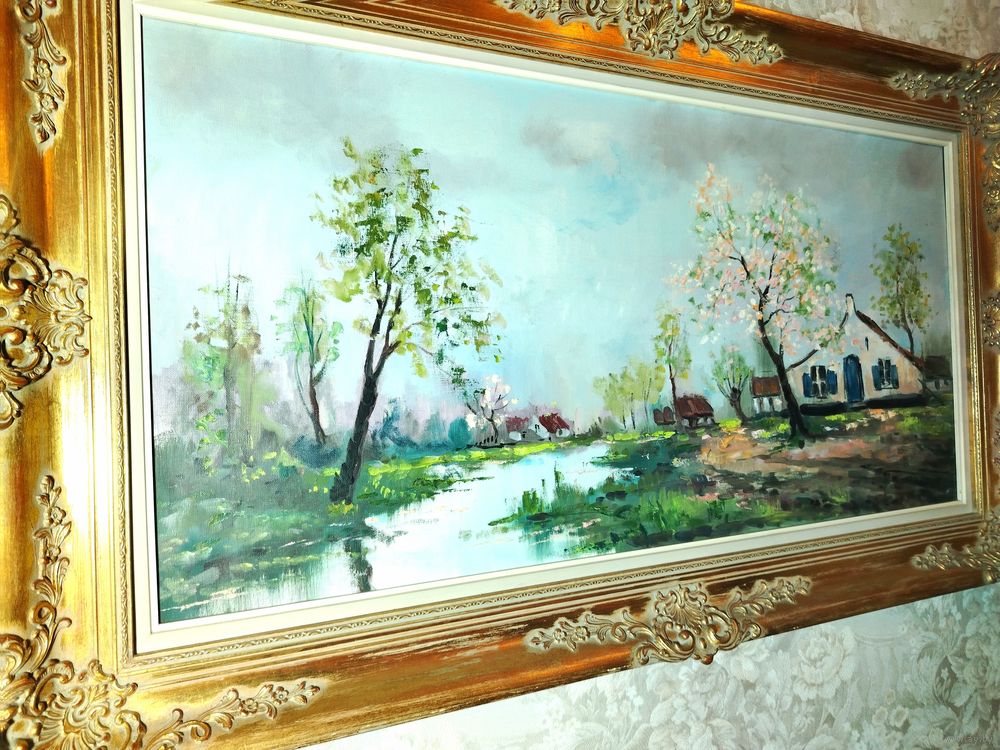 Картина в богатой раме. Европа. Холст, масло. Рама дерево и гипс. Высота 70 см ширина 120 см. Ширина рамы 12 см.