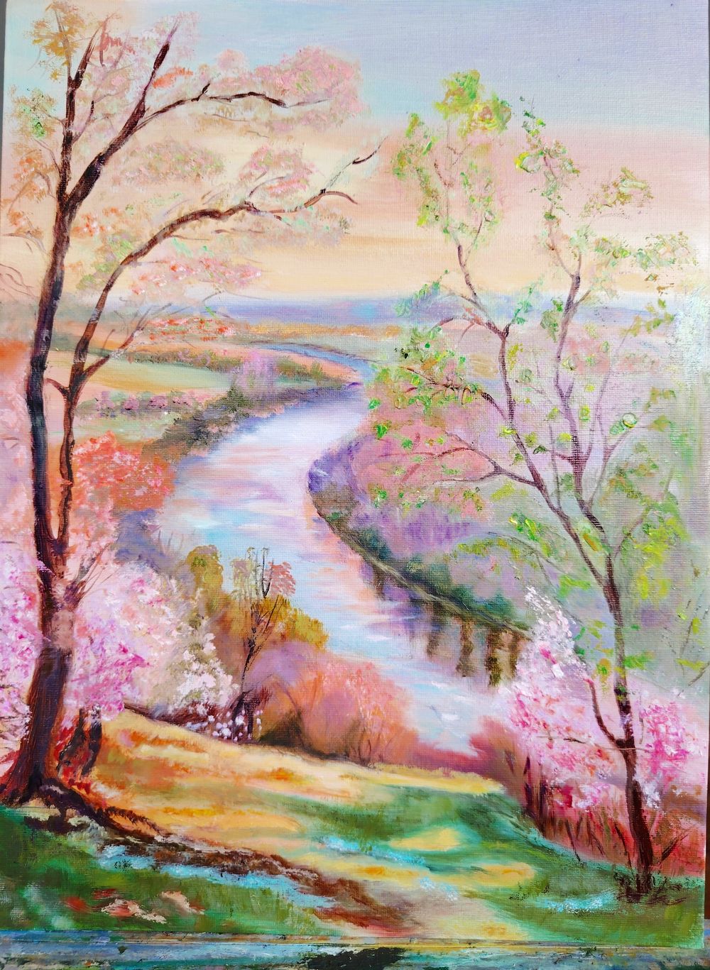 Картина Весна на рассвете написана мною в апреле текущего года. Холст на картоне, масло, 40х30. Применена техника мастехина. Смотрится изящно. Прекрасное дополнение интерьера.
