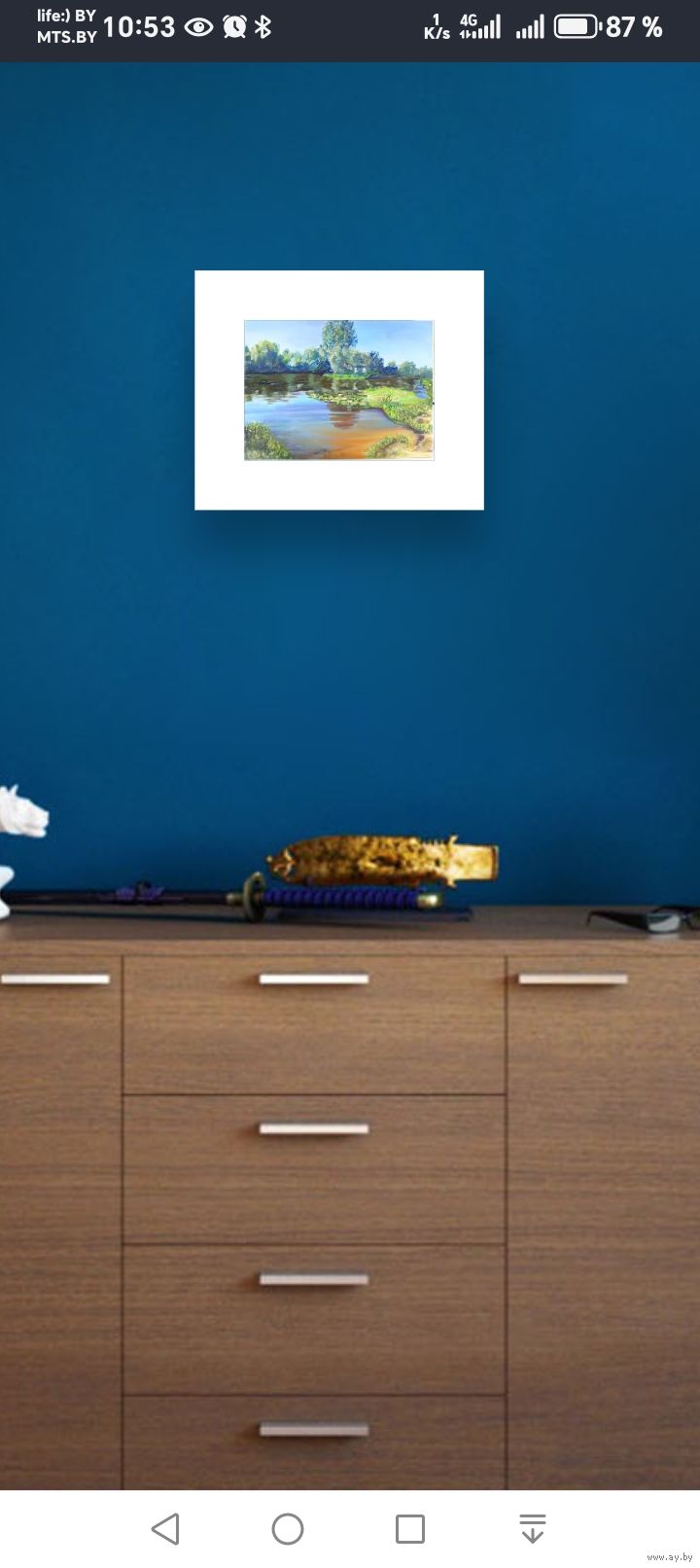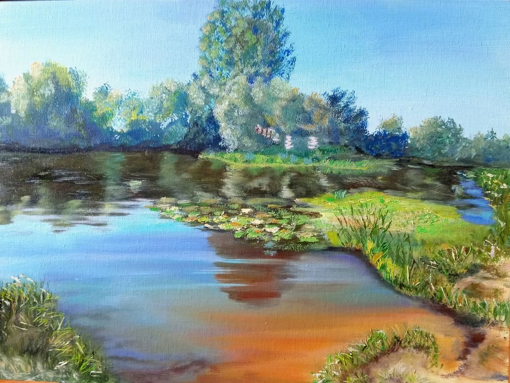 Картина Заводь от автора. Холст на картоне, масло, 40х30. Смотрится изящно. Создаётся впечатление живого присутствия на берегу реки. Прекрасное дополнение интерьера.