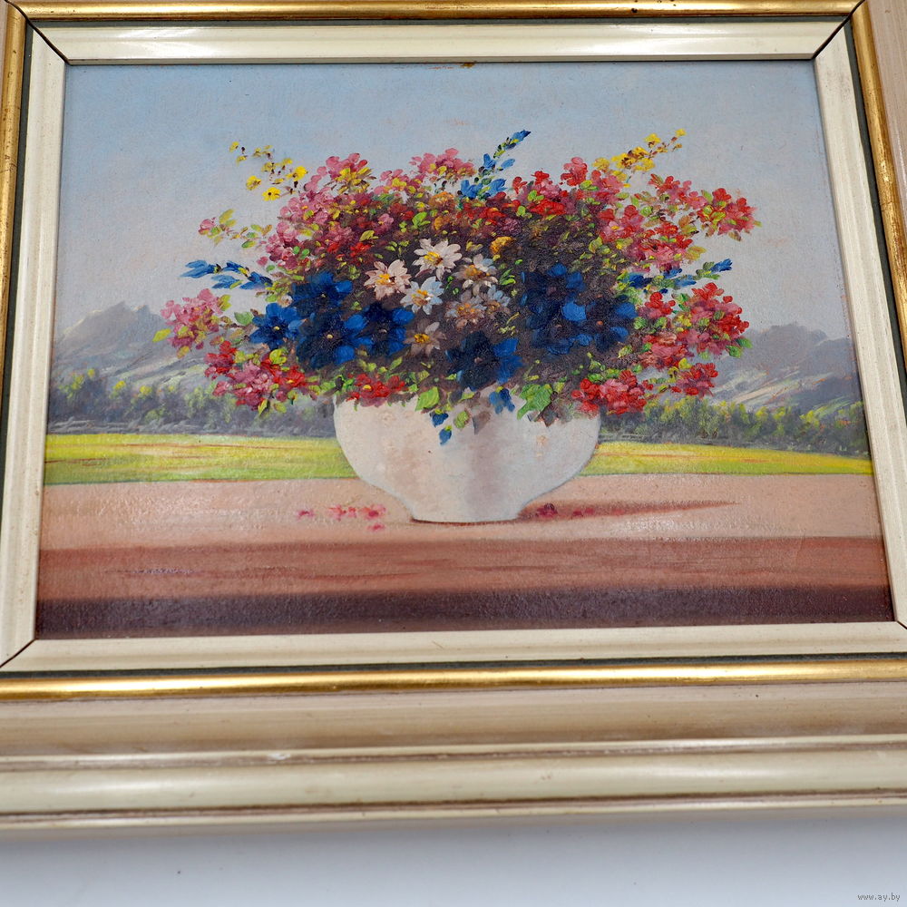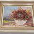 Парные винтажные картины в рамах из дерева, цветы на подоконнике маслом. Австрия. Размер 35 х 30 см. Подвес для настенного крепления.