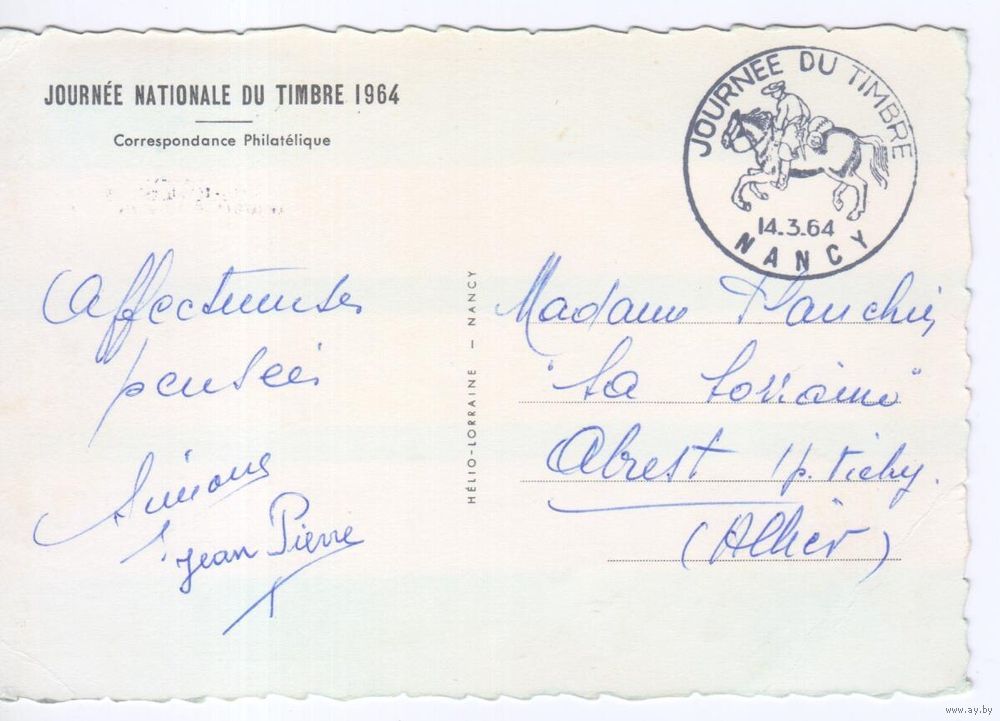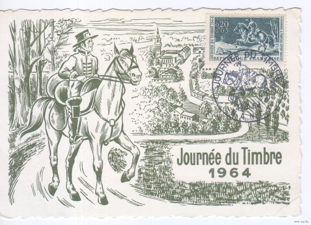 Картмаксимум Франция 1964г. Лошади на почтовых марках.Почтовый курьер. ГАШЕНИЕ СПЕЦШТЕМПЕЛЕМ (Нанси).