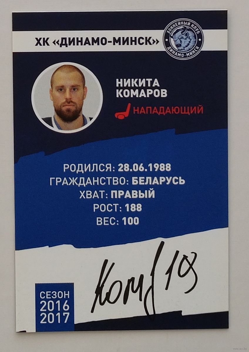 Карточка N19-Никита Комаров. ХК "Динамо Минск". Сезон 2016-2017.