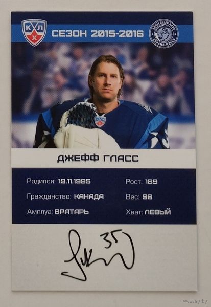 Карточка N35-Джефф Гласс. ХК "Динамо Минск". Сезон 2015-2016.