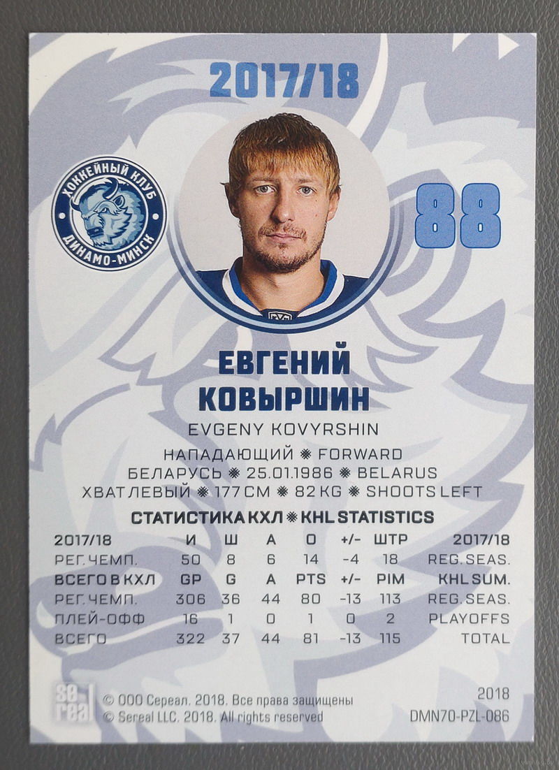 Карточка N88-Евгений Ковыршин. ХК "Динамо Минск". Коллекция "SeReal". 70 лет Динамо Минск. 2008-2018. DMN70-PZL-086