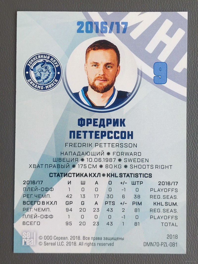 Карточка N9-Фредрик Петтерссон. ХК "Динамо Минск". Коллекция "SeReal". 70 лет Динамо Минск. 2008-2018. DMN70-PZL-081