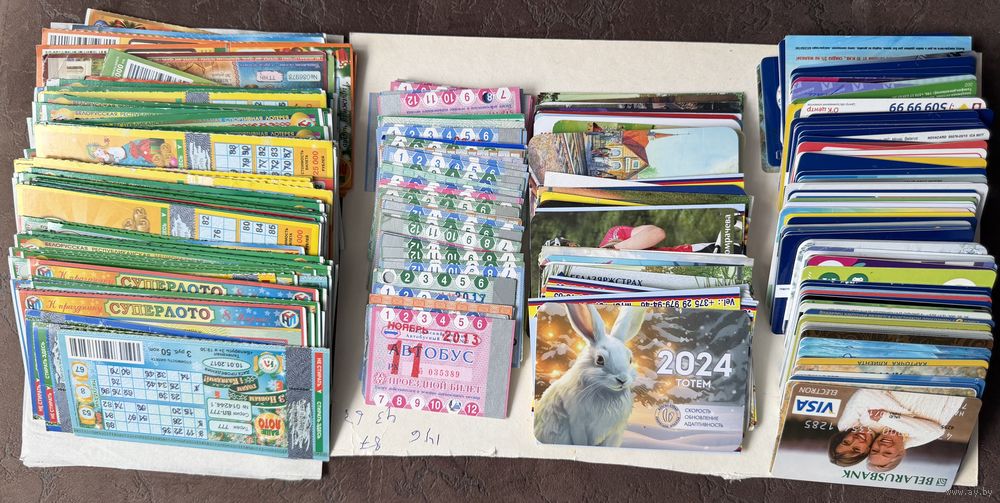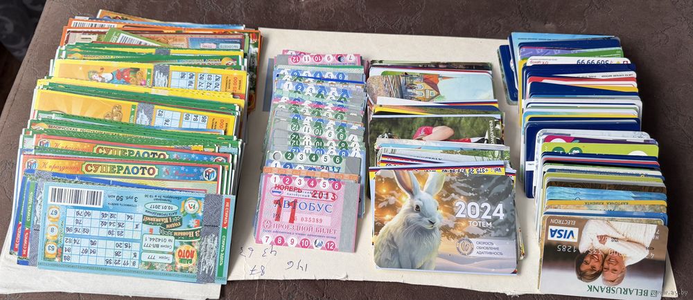 Карточки(83шт), 43 календаря, 63 проездных билета и 146 лотерейных билетов разных