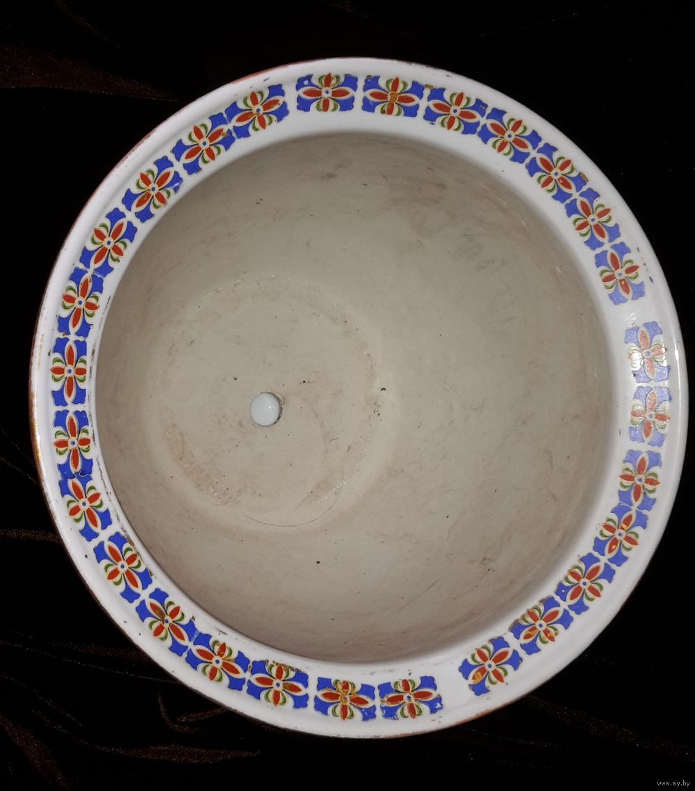Кашпо для больших растений. Жанровые сцены. Ручная роспись в технике Мориаж (Moriage), при которой рисунок эмалевыми красками не покрывается глазурью. Роспись получается не плоской, а рельефной, с очерченными границами, выполненными золотыми матовыми линиями. Оформление изделий отличается особой утонченностью штрихов, яркой расцветкой.