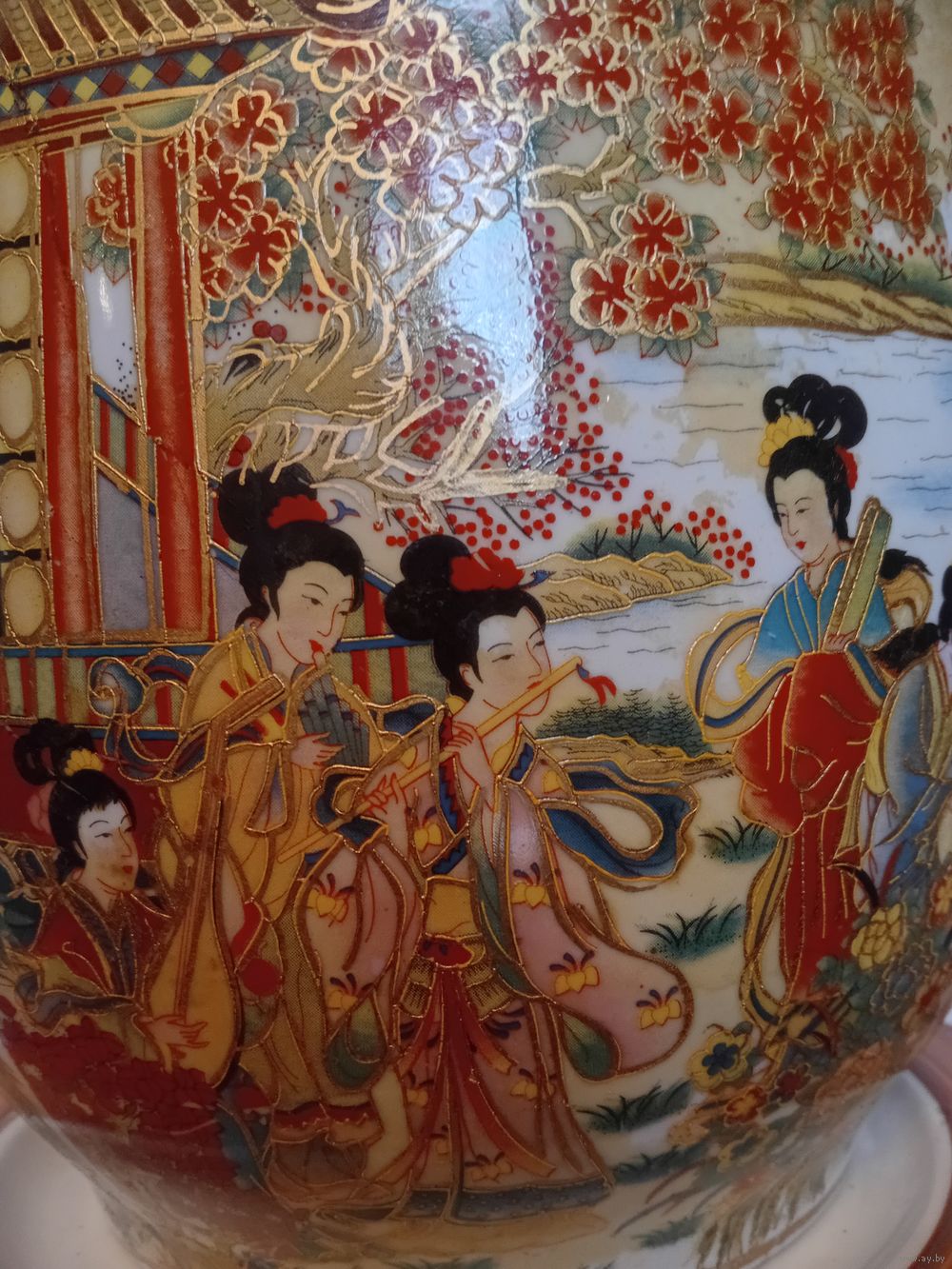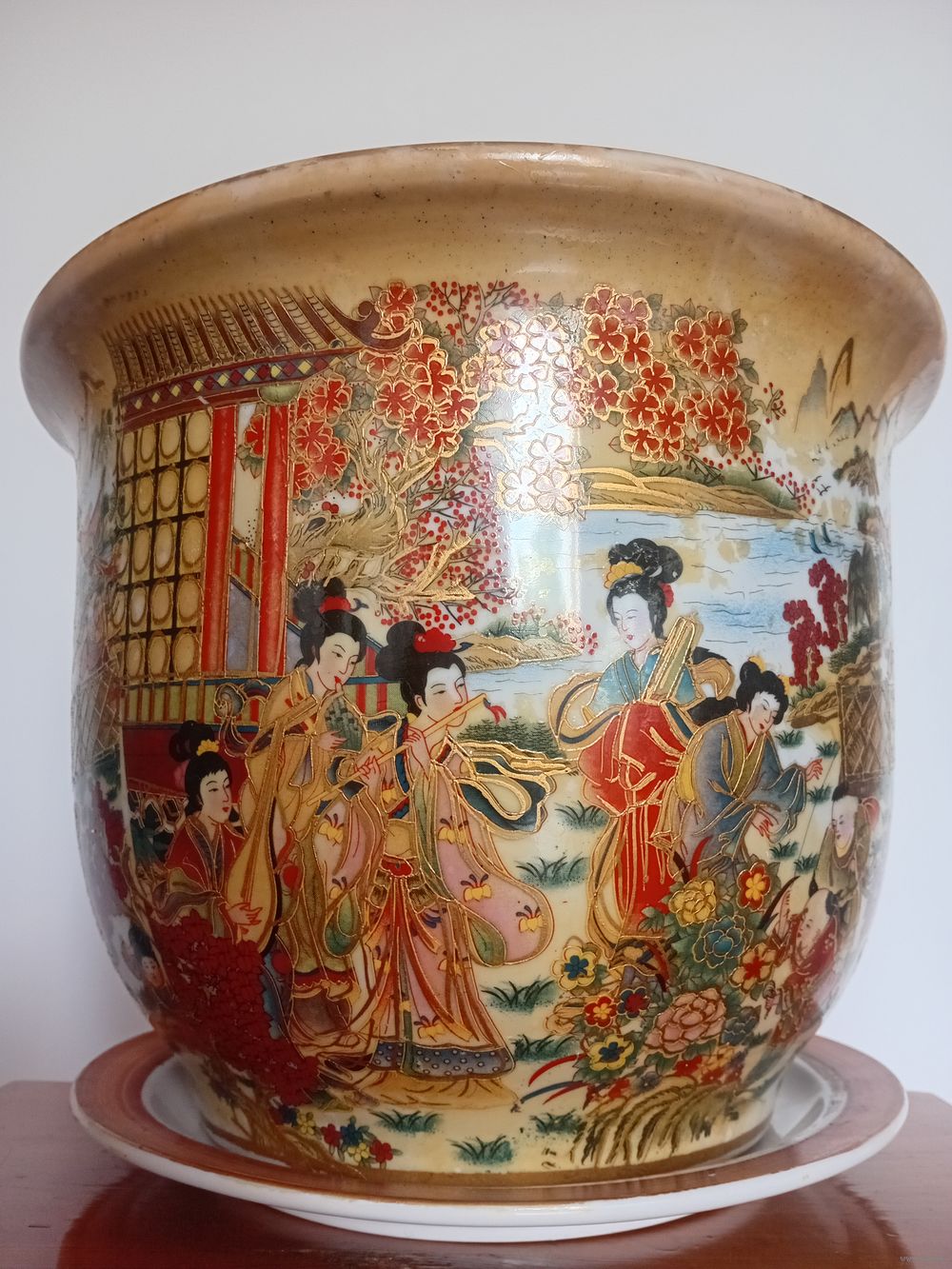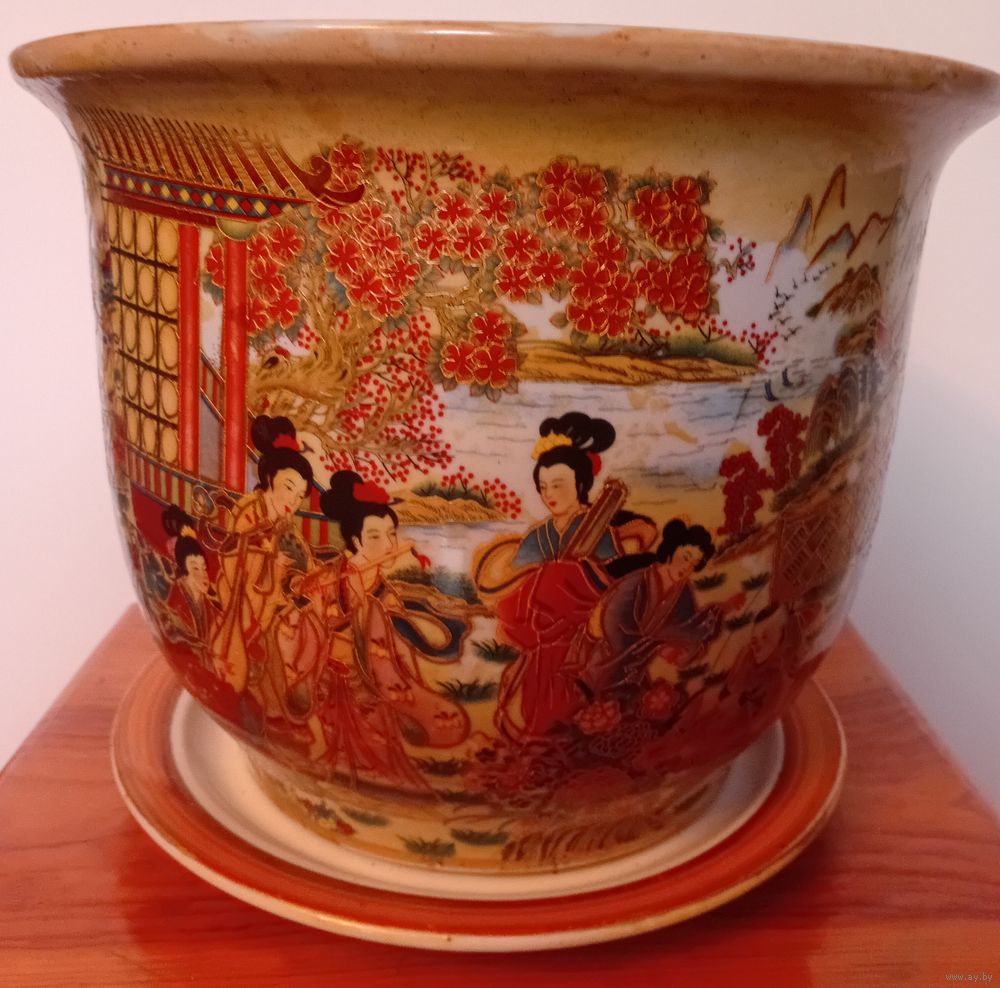 Кашпо для больших растений. Жанровые сцены. Ручная роспись в технике Мориаж (Moriage), при которой рисунок эмалевыми красками не покрывается глазурью. Роспись получается не плоской, а рельефной, с очерченными границами, выполненными золотыми матовыми линиями. Оформление изделий отличается особой утонченностью штрихов, яркой расцветкой.