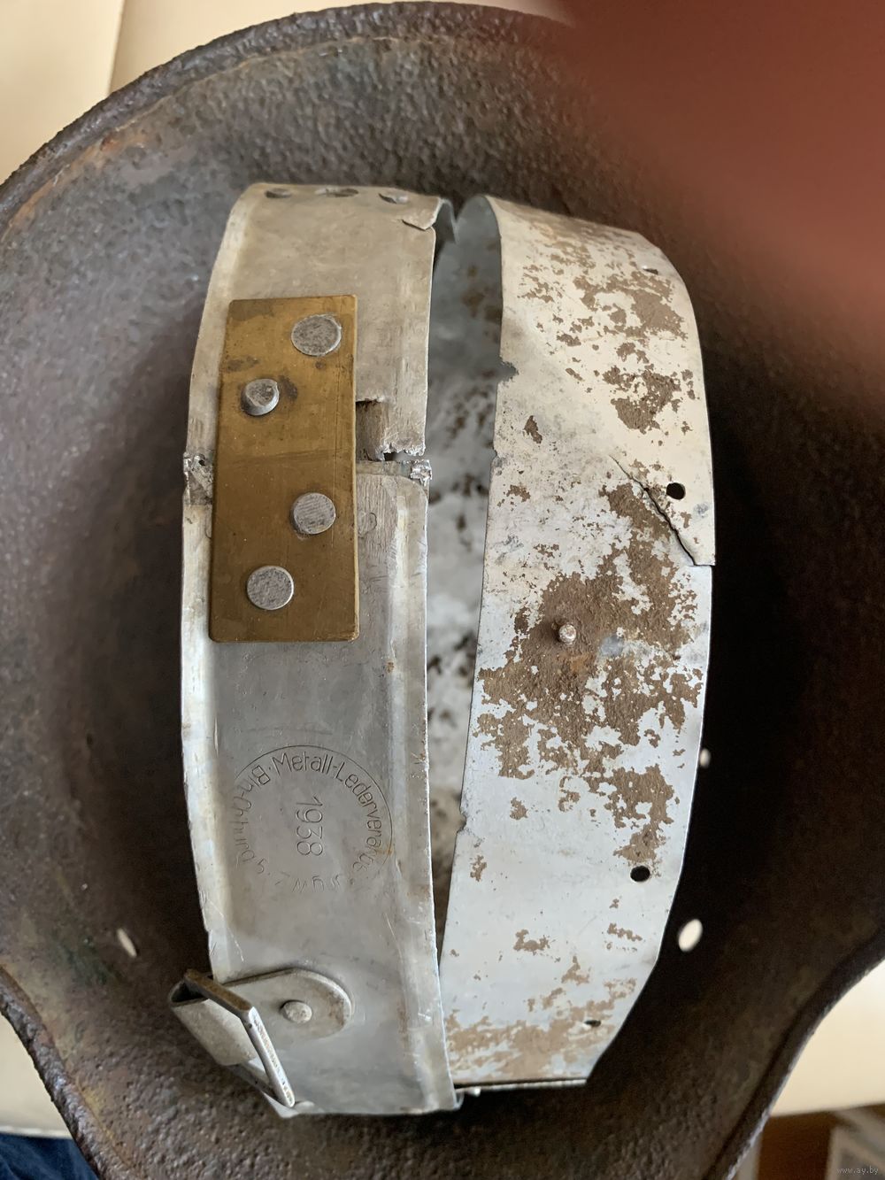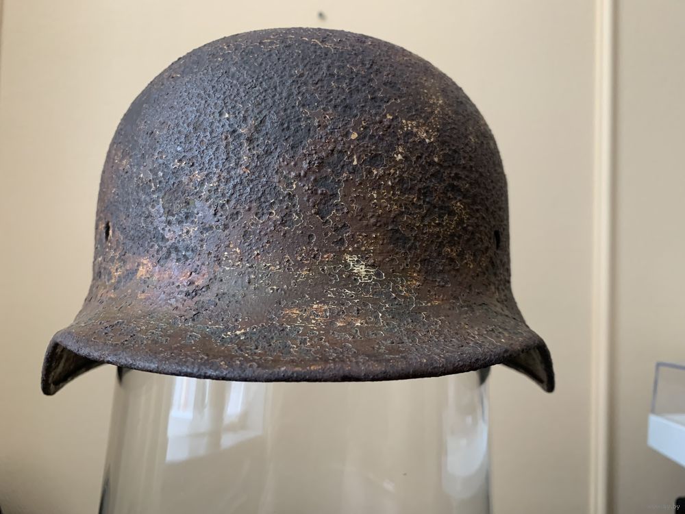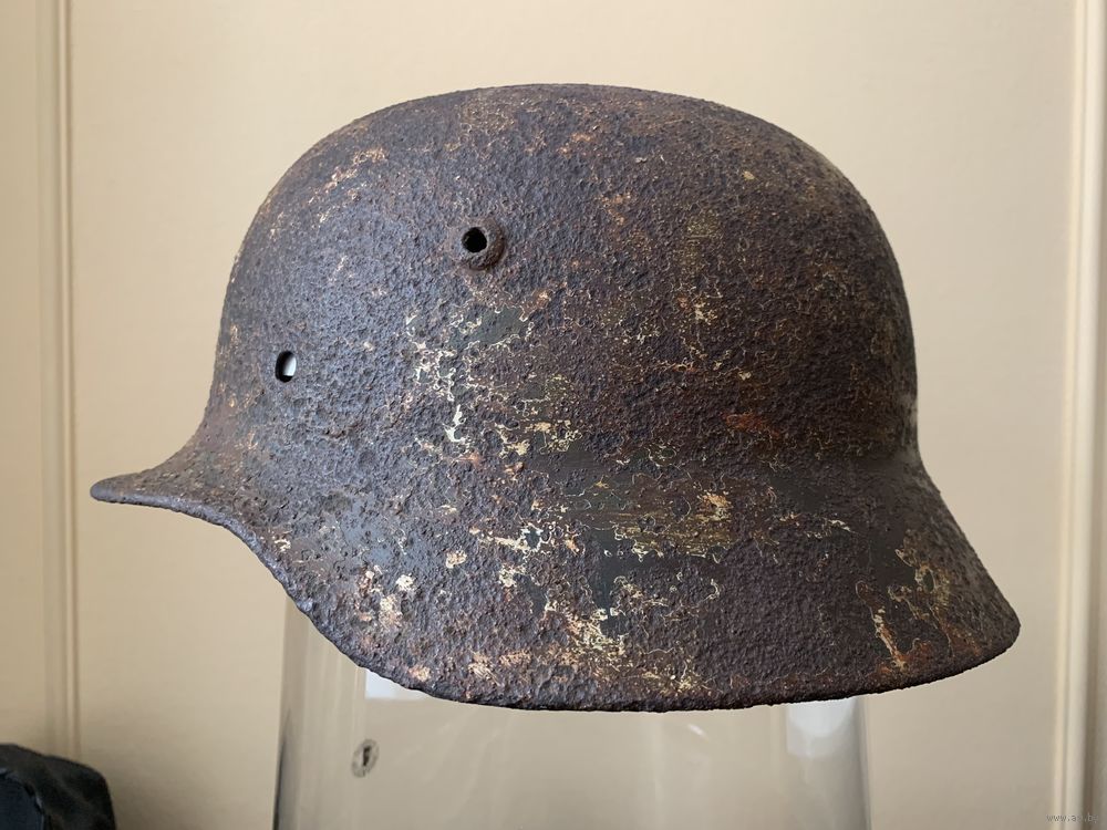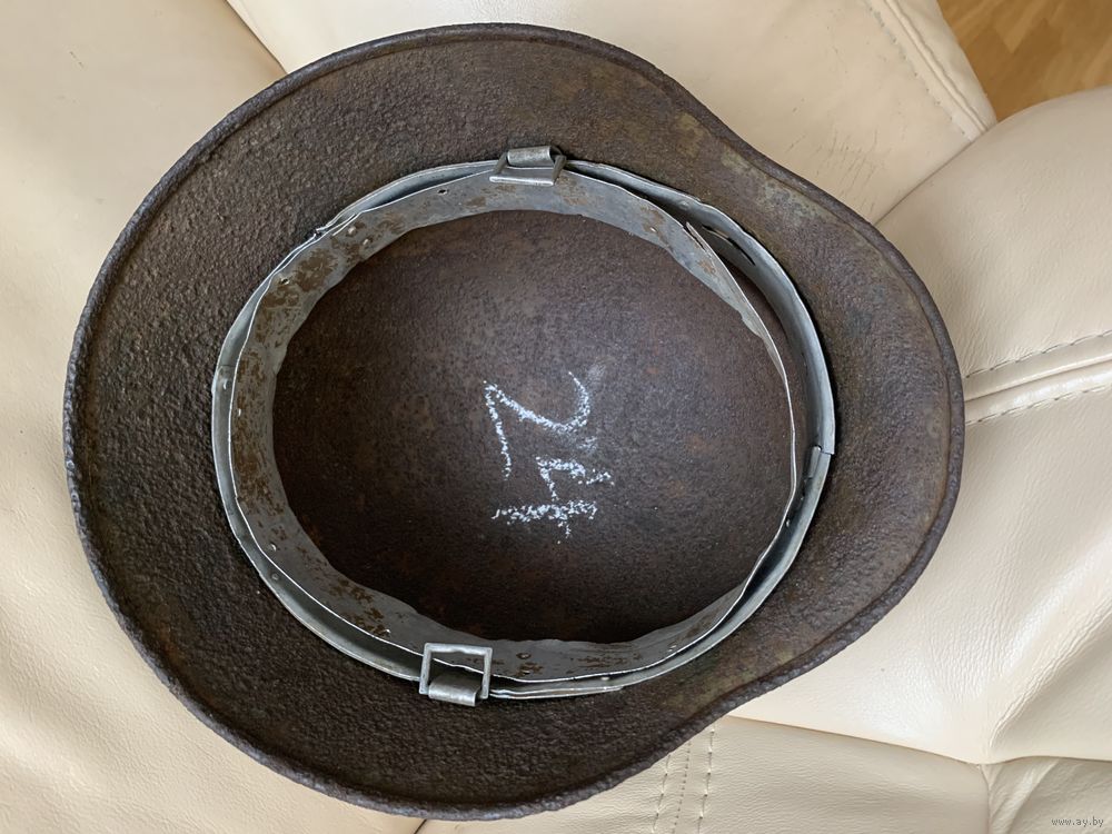 Каска М35, бодрый коп, без дыр и свищей, размер 62, остатки камуфляжа, в комплект входят два обода с потерями, но в рабочем состоянии, пригодном для монтажа.