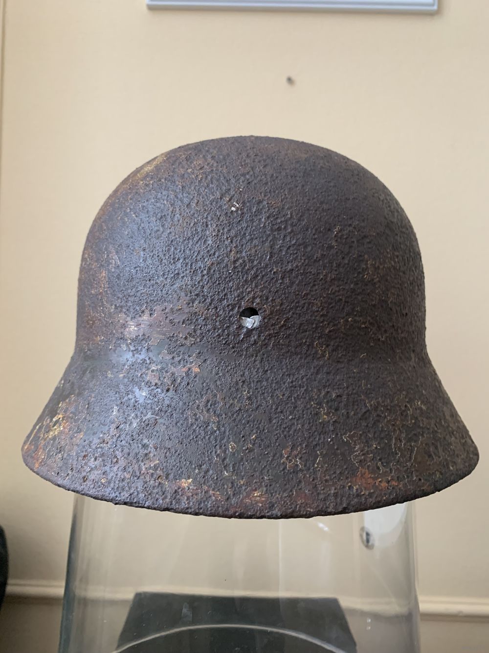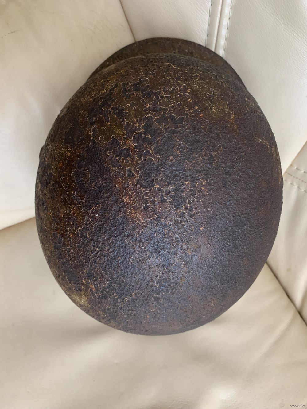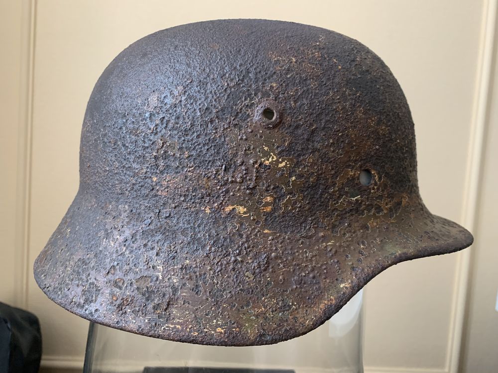 Каска М35, бодрый коп, без дыр и свищей, размер 62, остатки камуфляжа, в комплект входят два обода с потерями, но в рабочем состоянии, пригодном для монтажа.