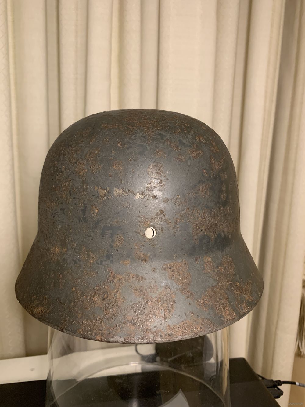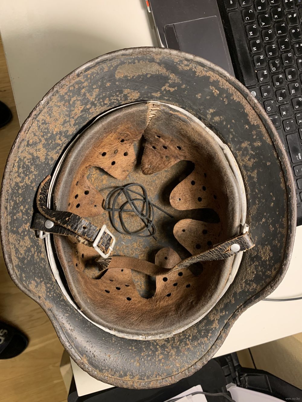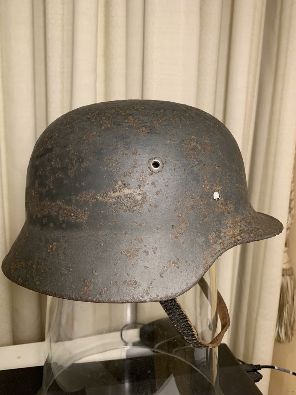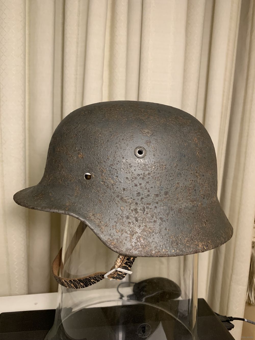 Комплект, состоящий из купола М35 Q64, очень бодрый коп, родная краска, небольшие коррозионные потери. Подшлемник на родных алюминиевых ободах 64/57, оригинальные кламмеры на коже, пружины правильный новодел, кожа и фетр - очень старый новодел. Ремешок - кожа старый новодел, катушки и пряжка в отличном состоянии оригинальные. Все элементы шлема прочные и надежные, можно смело использовать как для реконструкции, так и для интерактивной экспозиции. Размер головы 57, но по факту садится плотно и на 58 размер головы.
