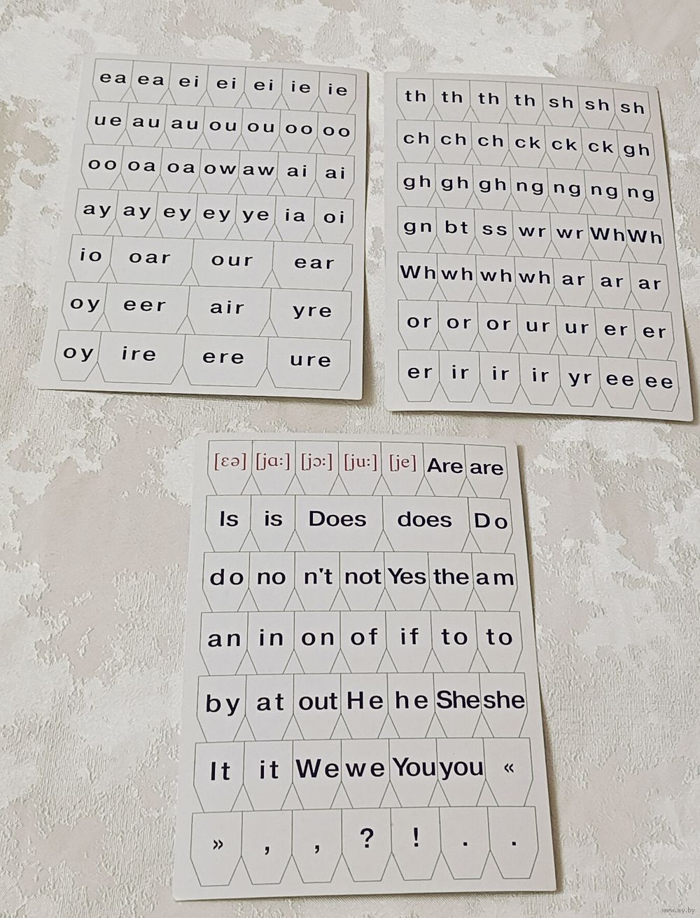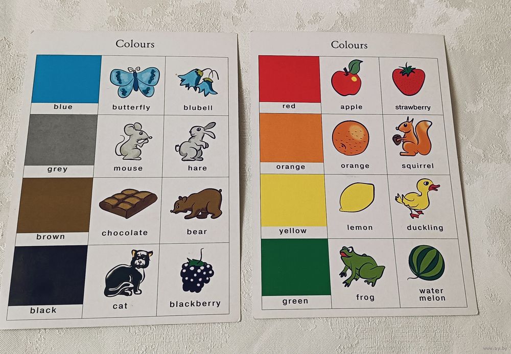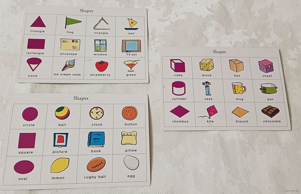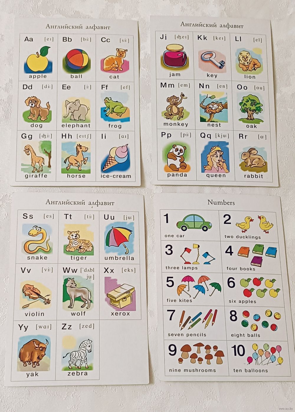 Карточки с обучающими материалами по английскому языку с иллюстрациями и транскрипцией слов на английском языке (алфавит, цифры, различные фигуры, цвета)