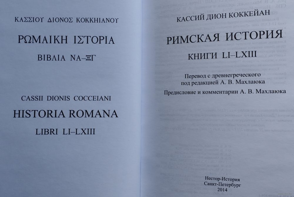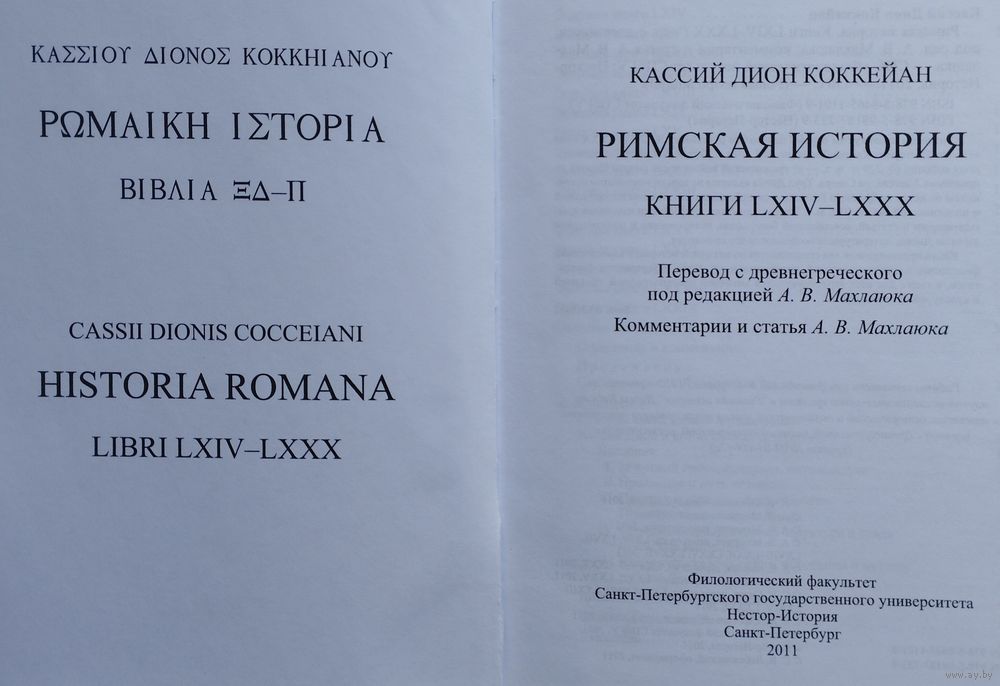 Цена за 2 тома. Большой формат. Тираж 1000 экз. 580 стр. В издании публикуется первый перевод на русский язык LXIV–LXXX книг «Римской истории» Кассия Диона, в которых освещаются события 69–229 гг. н. э. – от гражданской войны после смерти Нерона до правления Александра Севера. Труд Диона является не только важнейшим источником по истории Древнего Рима, но и своеобразным памятником исторической и политической мысли III в. н. э. Перевод снабжён подробными научными комментариями и статьёй, освещающей биографию, исторические и политические взгляды Диона, литературные особенности его сочинения.