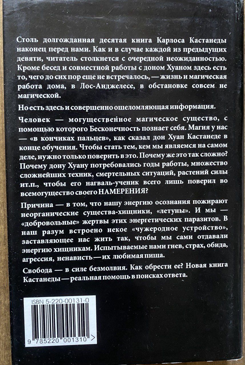 Столь долгожданная десятая книга Карлоса Кастанеды наконец перед нами. Как и в случае каждой из предыдущих девяти, читатель столкнется с очередной неожиданностью. Кроме бесед и совместной работы с доном Хуаном здесь есть то, чего до сих пор еще не встречалось, - жизнь и магическая работа дома, в Лос-Анджелесе, в обстановке совсем не магической. Но есть здесь и совершенно ошеломляющая информация. Человек - могущественное магическое существо, с помощью которого Бесконечность познает себя. Магия у нас - `в кончиках пальцев`, как сказал дон Хуан Кастанеде в конце обучения. Чтобы стать тем, кем мы являемся на самом деле, нужно только поверить в это. Почему же это так сложно? Почему дону Хуану потребовались годы работы, множество сложнейших техник, смертельных ситуаций, растений силы и т.п., чтобы его нагваль - ученик всего лишь поверил во всемогущество своего намерения?