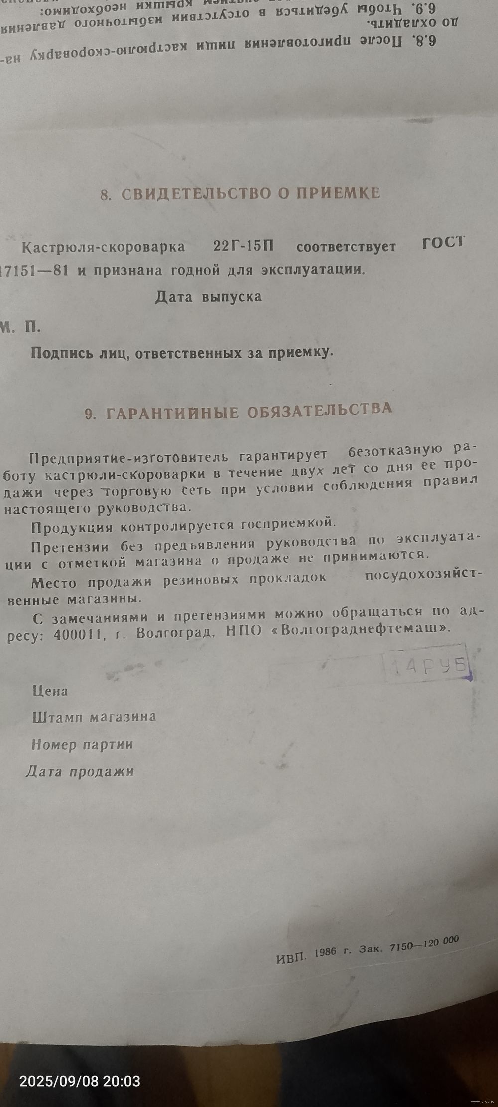 Продам кастрюлю-скороварку без МПЦ, СССР в упаковке, новая, вместимость 6 литров, состояние отдичное, не использовалась, в заводской упаковке с документами, г. Волгоград
