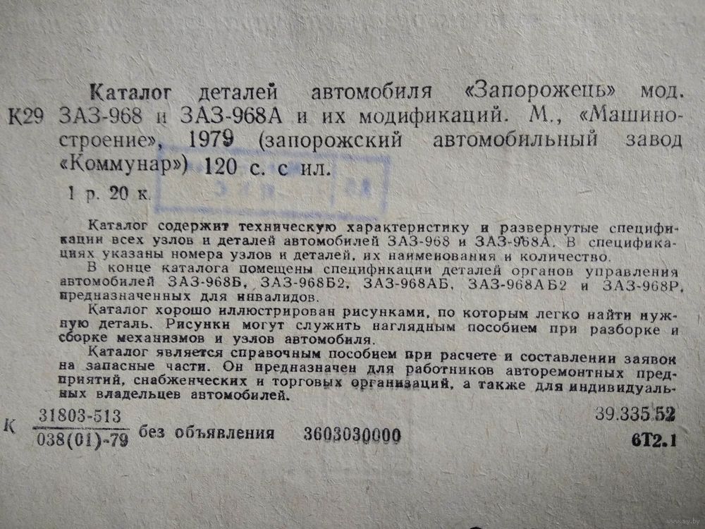 Каталог деталей автомобиля Запорожец моделей ЗАЗ-968, ЗАЗ-968А и их модификаций