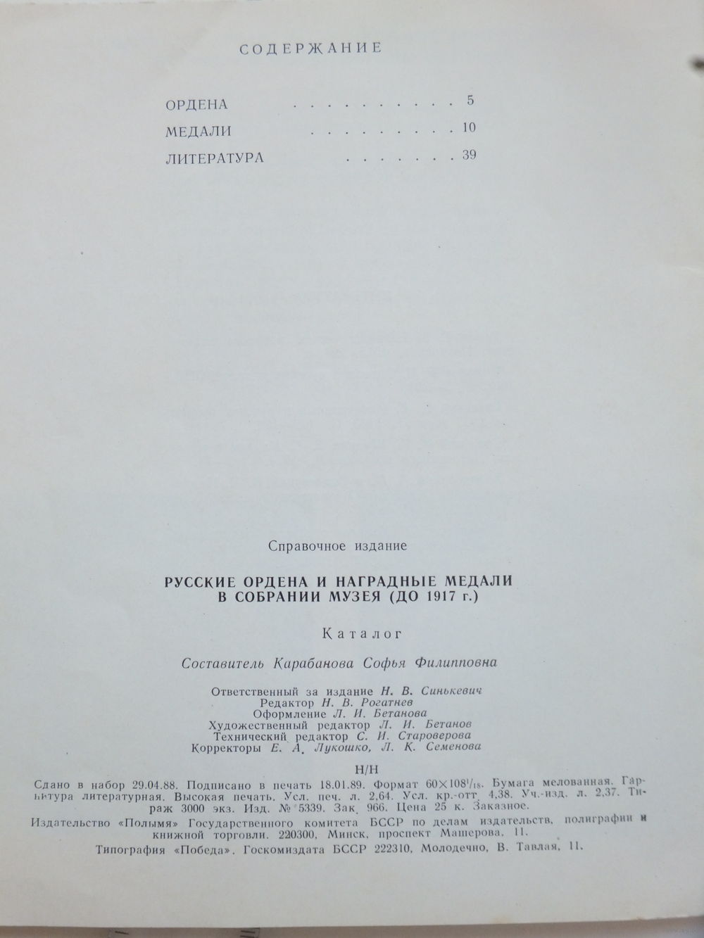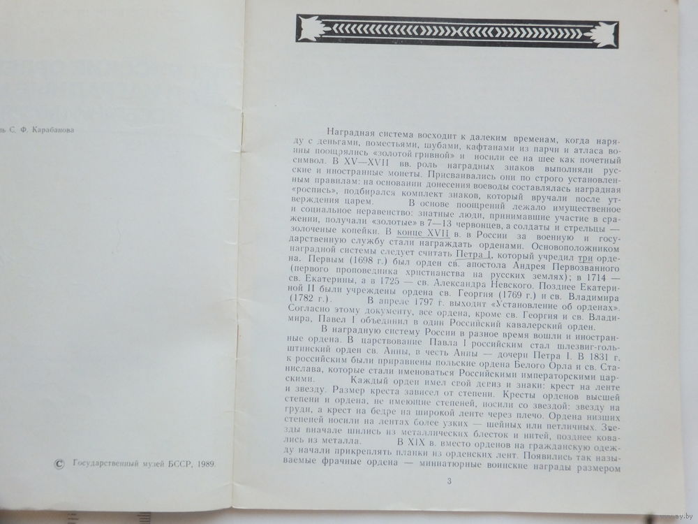 Каталог Карабанова ордена и медали в собрании госмузея БССР 1989