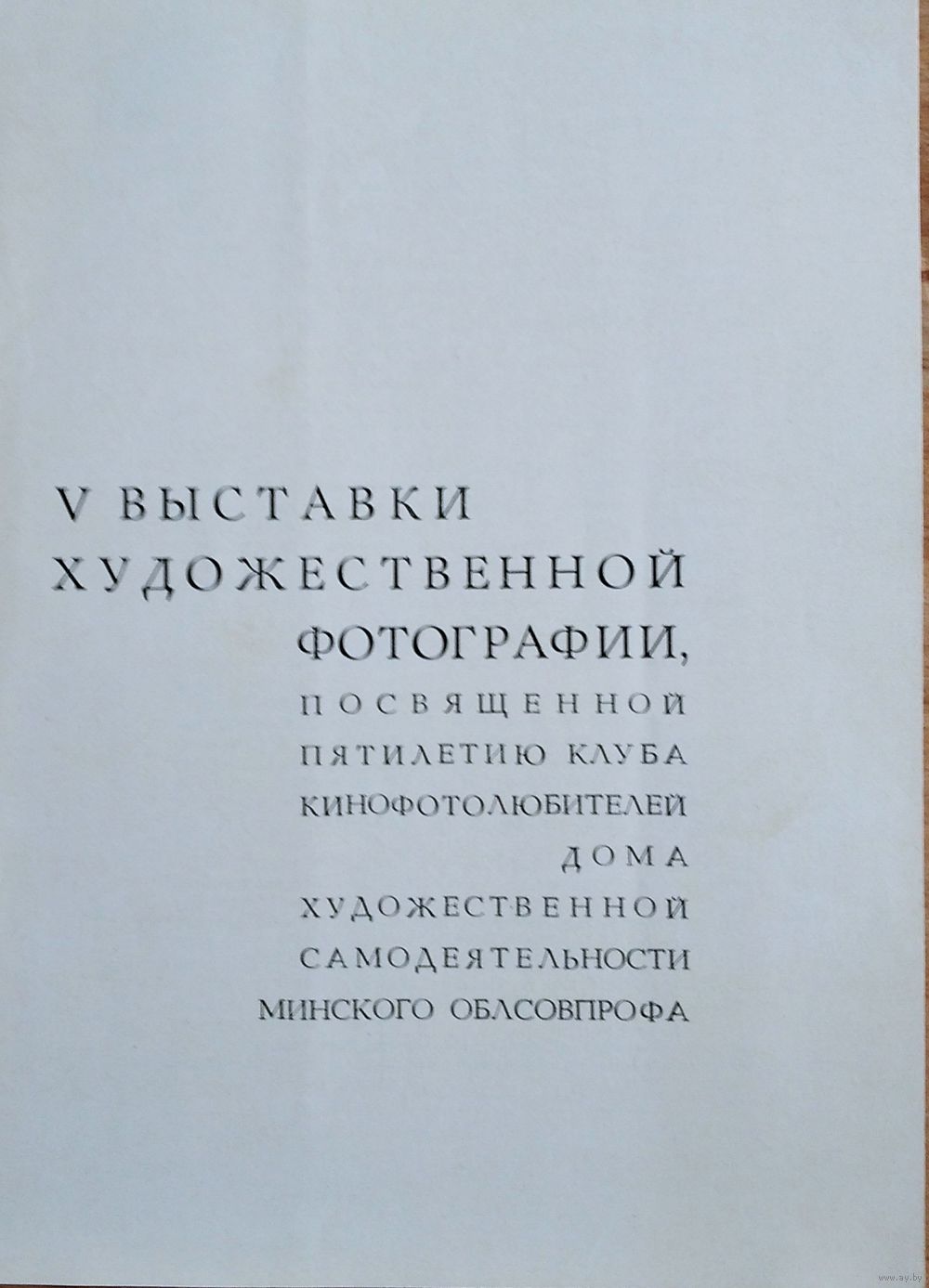 Каталог V Выставки художественной фотографии, посвященной пятилетию клуба кинофотолюбителей Дома художественной самодеятельности Минского Облсовпрофа. Предисловие В. Бархатовой. - Минск. Полымя, 1966 г. 20 с. Мягкая обложка.