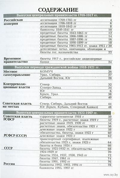 Особенности: Каталог включает в себя правительственные выпуски денежных знаков и приравненные к ним правительственными решениями заменители, обращавшиеся в сегодняшних границах Российской Федерации, выпуски территориальных отделений Госбанка, органов местного самоуправления, войсковых правительств и местных органов Советской власти периода гражданской войны. А5 формат, 80 страниц, монохромная офсетная печать.