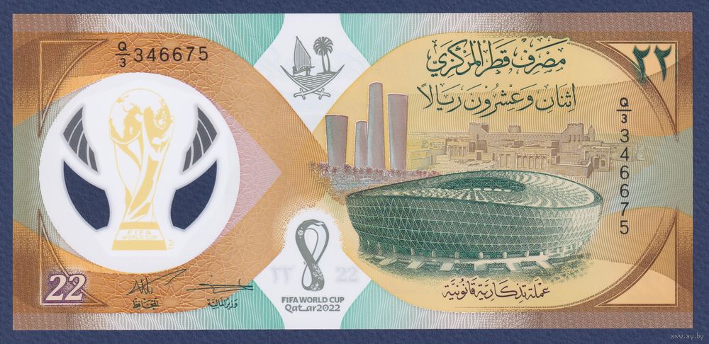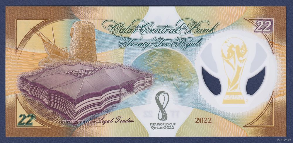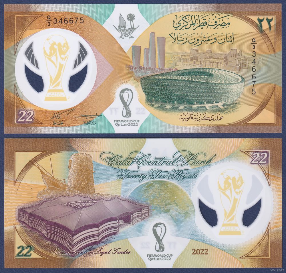 Катар, 22 риала 2022 г., P-W39 (Q|3, полимер, памятная - Чемпионат мира по футболу в Катаре), UNC