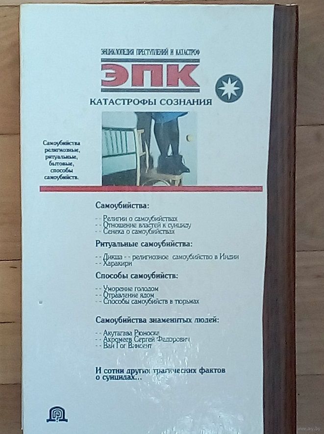 Автор-Трус Николай Валентинович, Ревяко Татьяна Ивановна.Серия-Энциклопедия преступлений и катастроф.Издательство-Литература.Год выпуска-1997.Тип обложки-Твердый переплет.Новая книга серии `Энциклопедия преступлений и катастроф` `Катастрофы сознания` освещает вопросы религиозных, ритуальных, бытовых самоубийств. Книга насыщена многочисленными примерами гибели величайших людей, а также массовыми катастрофами человеческого сознания.