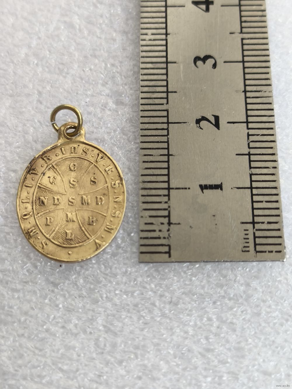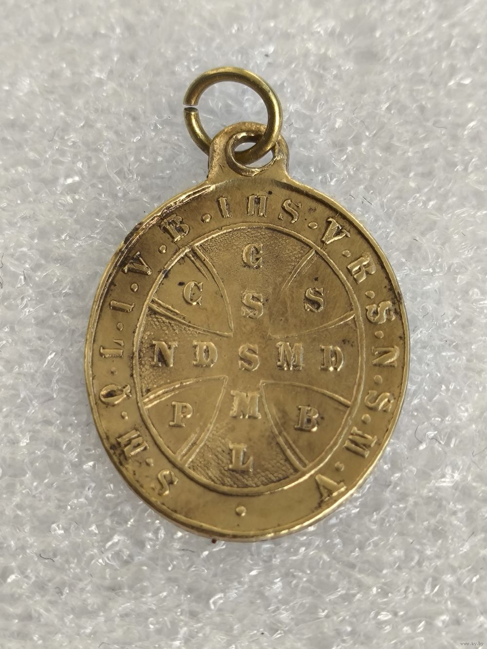На оборотной — крест (Крест святого Бенедикта) с аббревиатурами латинских молитв об изгнании нечистой силы.