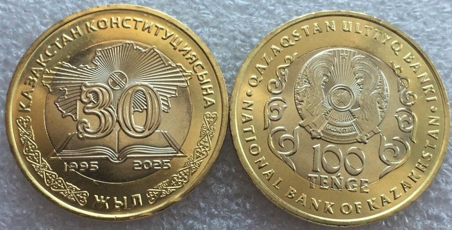 Казахстан 100 тенге 2025 г. 30-летие Конституции Казахстана. 30-летие Конституции Казахстана — знаменательная дата, отражающая исторический путь страны к построению правового государства и укреплению демократических институтов. Основной Закон является фундаментом независимости, символом единства и гражданского согласия. На монете изображена раскрытая книга, олицетворяющая Конституцию страны, над ней - число «30», выполненное на фоне контурной карты Казахстана. В центре карты размещен шанырак, который символизирует солнце. Особенность монеты – декоративное оформление числа «30» с использованием технологии золочения.