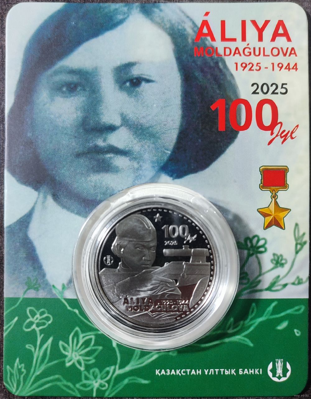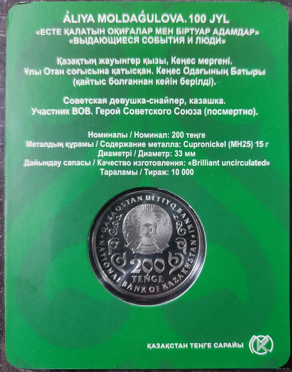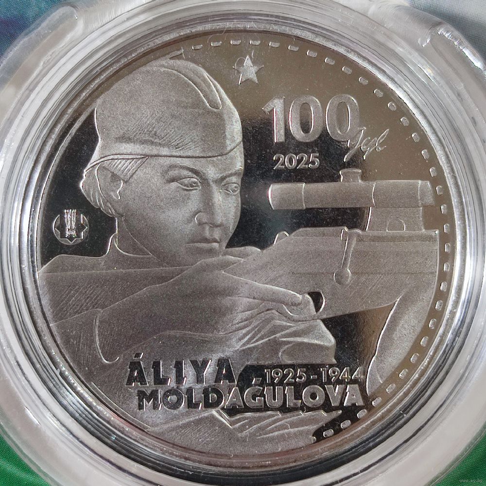 Казахстан 200 тенге 2025 г. Герой СССР Снайпер Алия Молдагулова. 100 лет. В блистере.