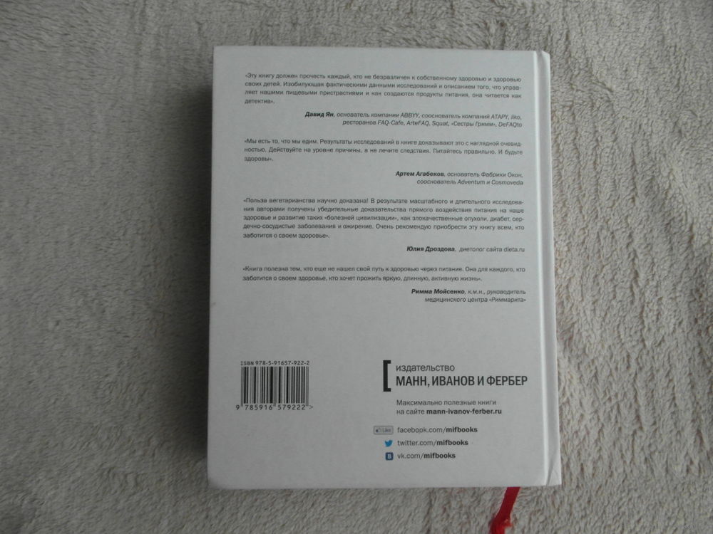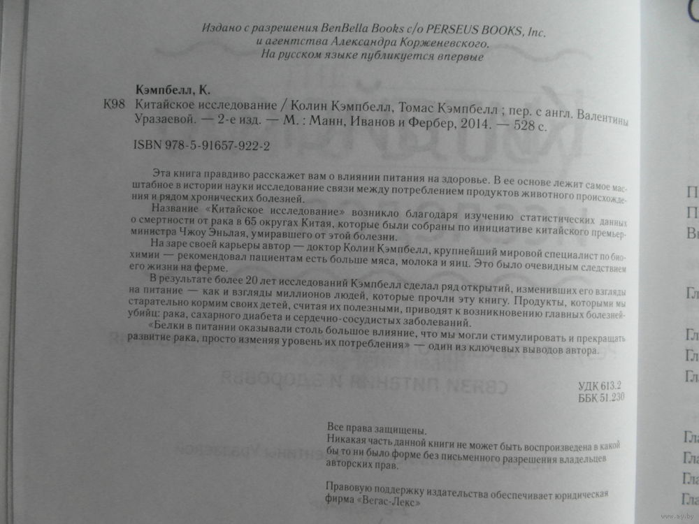 О влиянии питания на здоровье. В основе книги лежит самое масштабное в истории науки исследование связи между тем, что мы едим и тем, чем мы болеем. Автор книги — крупнейший мировой специалист по биохимии — Колин Кэмпбелл сделал ряд открытий, которые изменили взгляды на питание миллионов людей. Оказывается, продукты, которыми мы старательно кормим своих детей, считая их полезными, приводят к возникновению главных болезней-убийц: рака, сахарного диабета и сердечно-сосудистых заболеваний. Эта книга для всех, кого интересует собственное здоровье и здоровье своих близких, для тех, кто стремится к долгой и активной жизни. Китайское исследование» возникло после изучения статистических данных о смертности в 65 округах Китая, которые были собраны по инициативе премьера-министра Чжоу Эньлая, умиравшего от рака. 690Гр