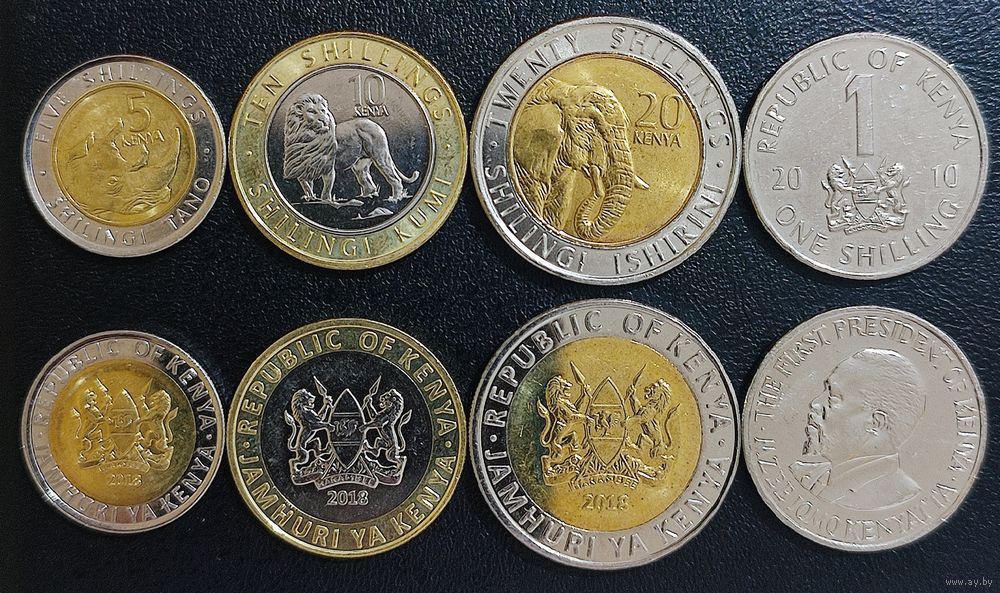 Кения 1 шилинг 2010г. , 5, 10, 20 шиллингов 2018 г. (набор 4 монеты).