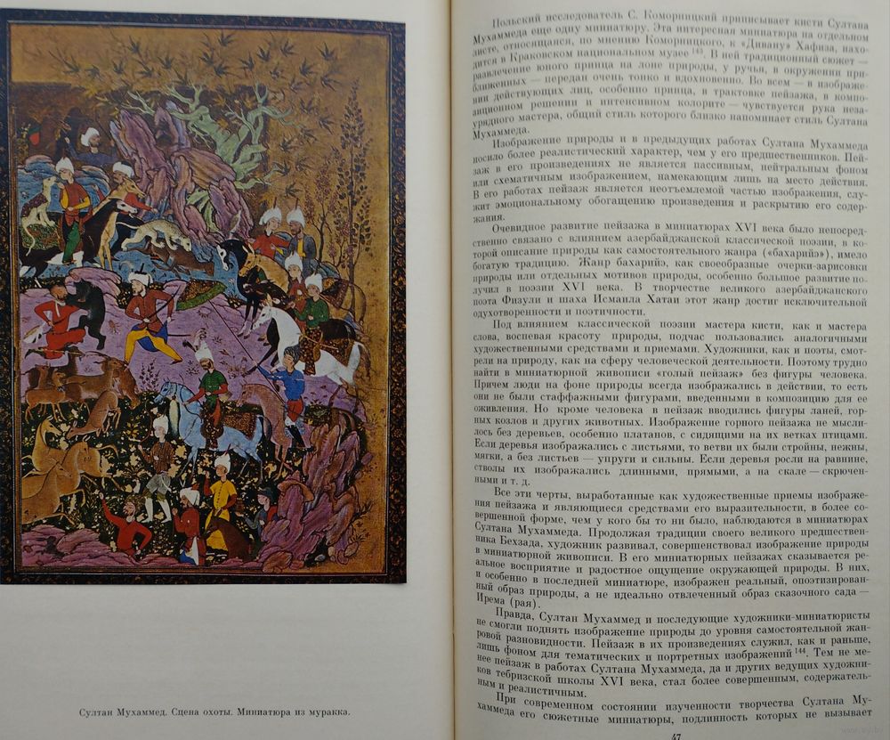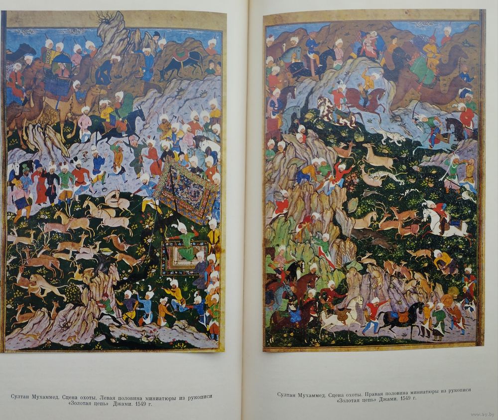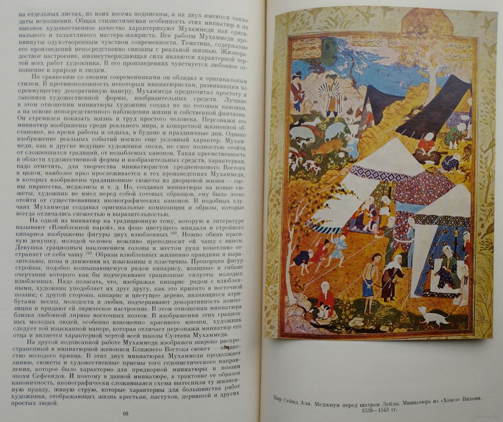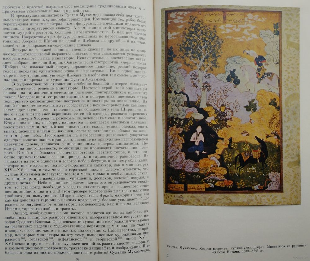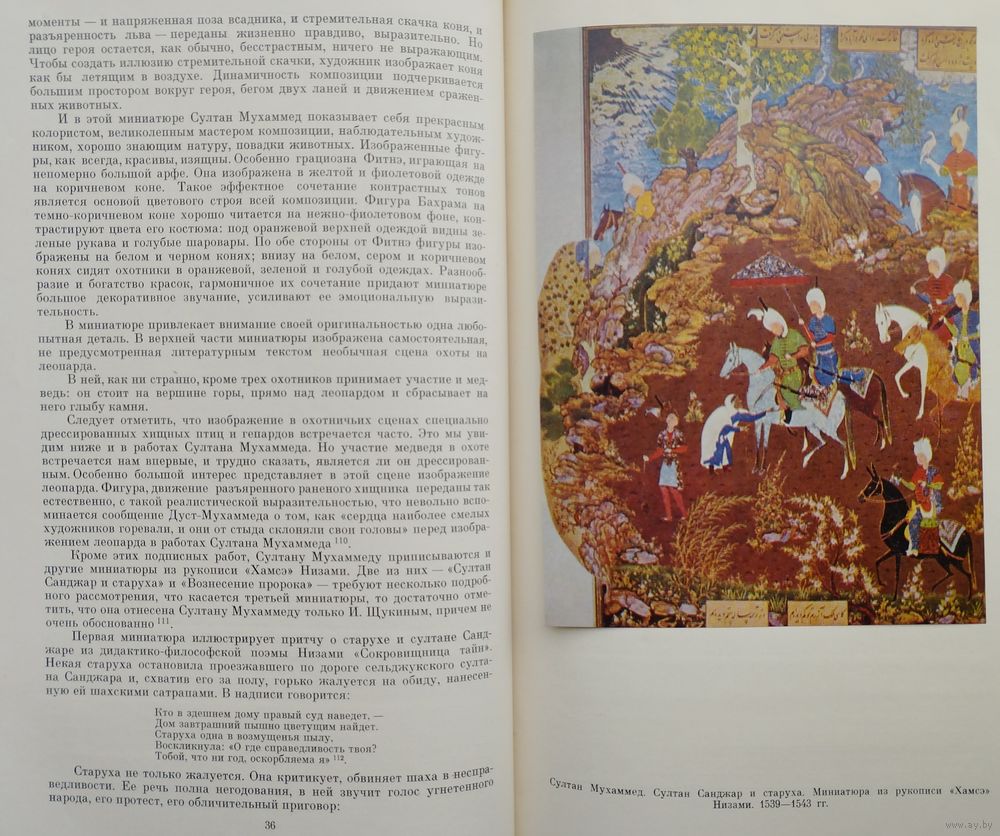 Большой энциклопедический формат. Мелованный альбом. Ляссе. Тираж 2000 экз. 108 стр. Живописную серию школы Султана Мухаммеда открывает «Диван» Хафиза, созданный в шахской библиотеке около 1533 года для Сам-Мирзы, брата шаха. В миниатюрах Султана Мухаммеда отчетливо виден полный отход от принципов и формул, выработанных Бехзадом, и «Сцена попойки» является тому прекрасным примером. Это миниатюра - важнейшее из творений Султана Мухаммеда, она характеризуется подчеркнутым реализмом, переходящим подчас в гротеск, более масштабной композицией, большей насыщенностью фигурами и другими изобразительными элементами, большей эмоциональностью и более мощным динамизмом. Мир-Мусеввиру в этом роскошном экземпляре «Хамсе» принадлежит одна миниатюра на сюжет «Нуширван и совы» в поэме Низами «Сокровищница тайн». Весьма оригинальная по композиции и разработке отдельных деталей, эта миниатюра иллюстрирует один из очень поучительных рассказов Низами. Однажды сасанидский царь Нуширван, увлекшись охотой, отдаляется от своей свиты. В сопровождении лишь одного из визирей царь подъезжает к разрушенной деревне; на одной из разрушенных стен они видят двух сов. От криков сов, разносившихся над этими жуткими развалинами, царю становится не по себе, и он спрашивает визиря, о чем они говорят. Тот отвечает, что одна из сов выдает свою дочь замуж и требует в качестве платы эту разрушенную деревню и еще несколько подобных деревень из окрестностей. Другая отвечает, что выполнить эту просьбу не составит труда, ибо пока жив царь Нуширван, народ будет и дальше бедствовать и нищать, и поэтому недостатка в разоренных селениях не будет. Здесь поэт устами мудрого визиря обличает злоупотребления и несправедливость государей прошлого, в иносказательной форме призывая современных ему правителей быть справедливыми, дать народу свободу и процветание. Смысл жизни царей, по Низами, не в пирах, охотах и наслаждениях, а в служении народу и прославлении себя добрыми делами. На полной повествовательности миниатюре, иллюстрирующей этот сюжет, изображены на конях Нуширван и его визирь, движение которых остановили голоса сов, сидящих на руинах некогда пышного дворца. Нуширван, вооруженный луком и стрелами в колчане, сидит на красном коне, а едущий следом визирь — на серовато-желтом муле. На возвышенной части развалин заброшенного дворца уже свил гнездо аист, здесь выведены птенцы. Два других аиста летят в облачном небе, один из них несет в гнездо птенцам убитую змею. С верхней части арки свисают живые змеи, украдкой подползающие к гнезду аиста. На самом верху портала разрушенного дворца сидят две совы. Элементы пейзажа скомпонованы со вкусом: громоздящаяся красочная скала с деревом, под которым на камнях кустик, сплетение ветвей деревьев и т. д. В ярких красках даны и костюмы персонажей, весьма достоверны их доспехи и орудия труда. На некоторых местах руин дворца обнажились облицовочные плиты, оголилась стена и видна кирпичная кладка. Эта жизнерадостная по колориту миниатюра, сочетающая реалистичное изображение фауны и флоры со сказочностью и декоративностью восприятия, характеризует новый стиль тебризской миниатюры. Но условно декоративная манера ее не раскрывает идею литературного произведения, направленного против разрушительных войн, причиняющих людям бедствия