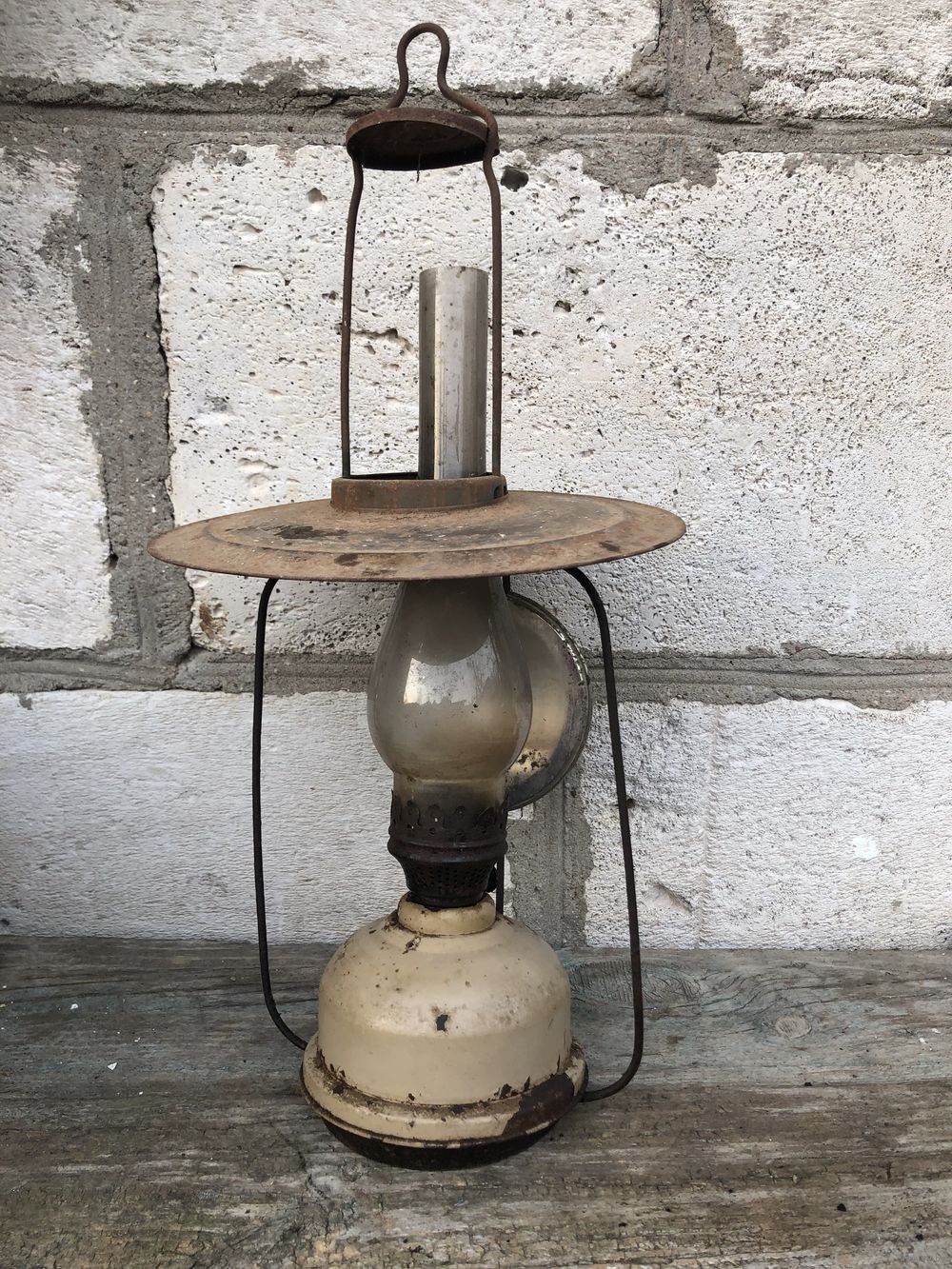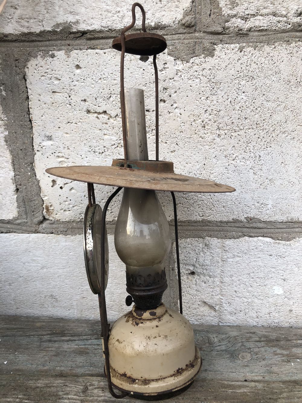 Состояние: Натуральный ретро-вид. Стеклянная колба («стекло») целая, без трещин и сколов. Механизм подъема фитиля на месте.