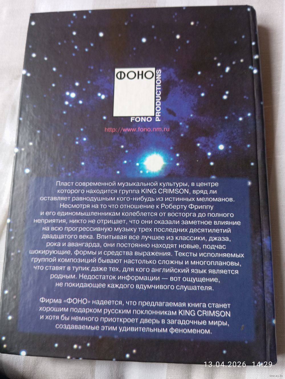 Русифицированный King Crimson. Кальницкий В. Раритет! СПб Фоно 2000. В хорошем состоянии, тв переплет, увеличенный формат. Тираж 3000. В данном виде больше не переиздавалась и не будет. Иллюстрации, дискография, статьи. Возможность отправки Белпочтой, исключительно. Полная предоплата на карту Беларусбанк. Без наложенного платежа