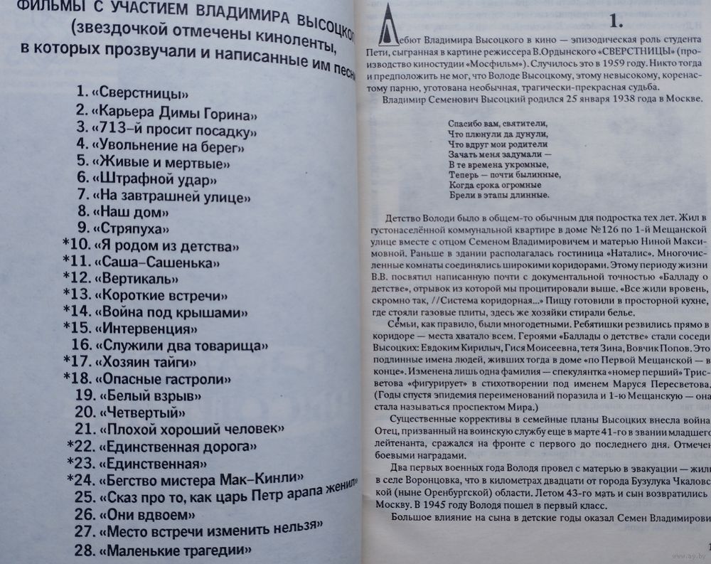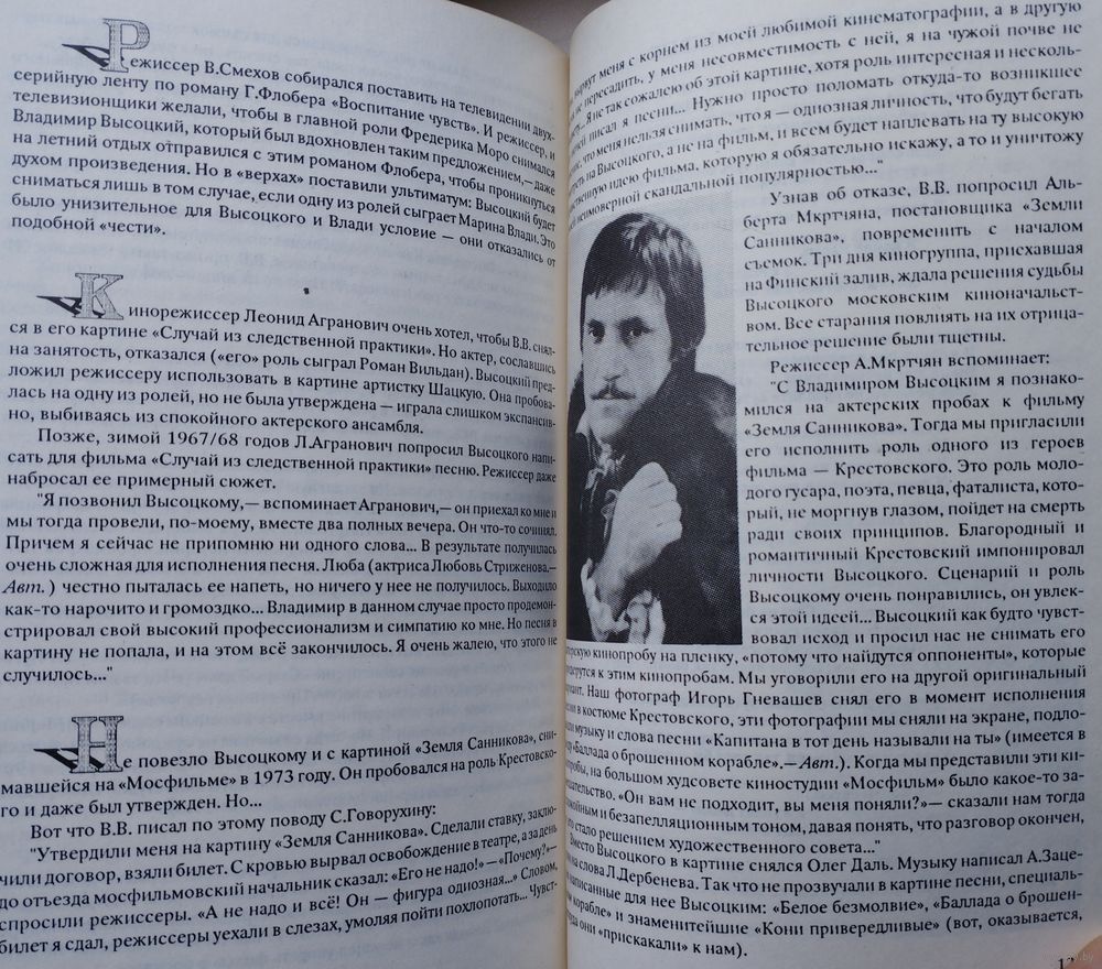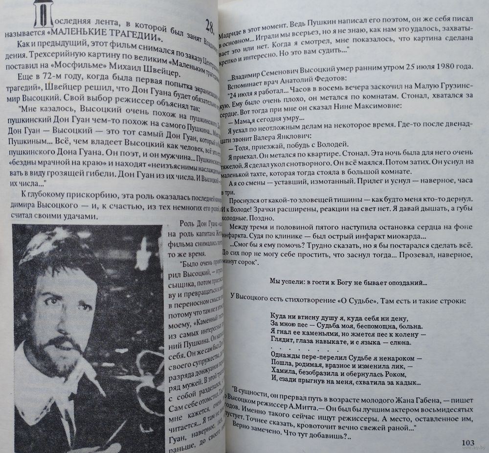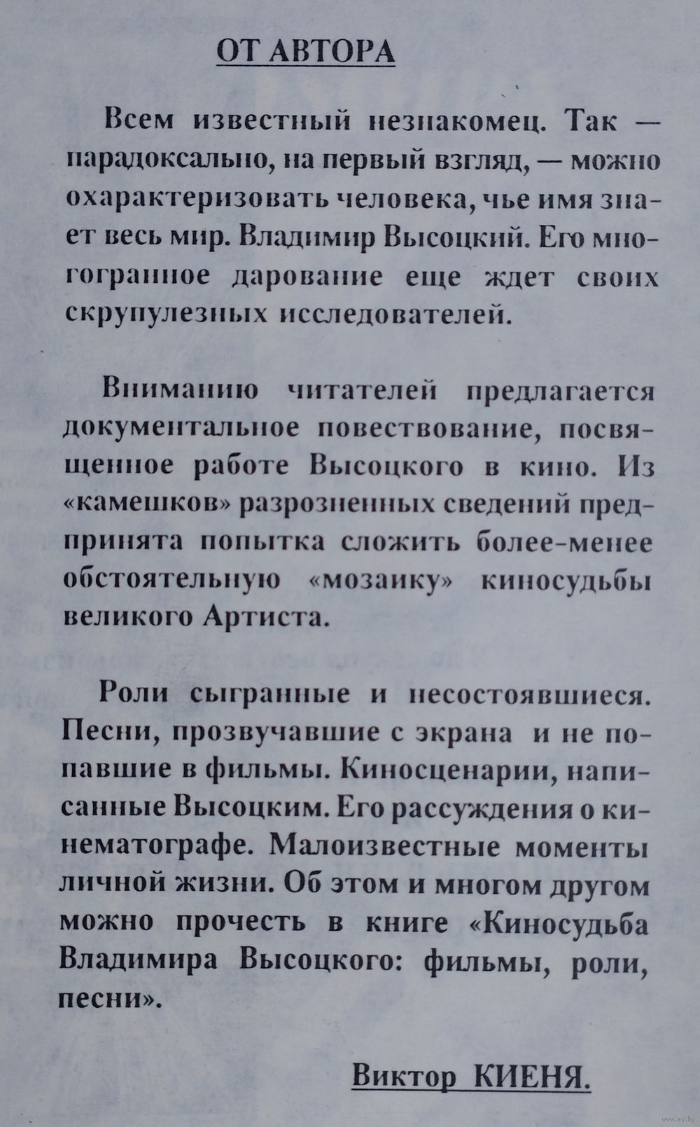 Тираж 9000 экз. 178 стр. Вниманию читателей предлагается документальное повествование, посвященное работе Высоцкого в кино. Из "камешков" разрозненных сведений предпринята попытка сложить более-менее обстоятельную "мозаику" киносудьбы великого Артиста. Роли сыгранные и несостоявшиеся. Песни, прозвучавшие с экрана и не попавшие в фильмы. Киносценарии, написанные Высоцким. Его рассуждения о кинематографе. Малоизвестные моменты личной жизни. Об этом и многом другом можно прочесть в книге "Киносудьба Владимира Высоцкого: фильмы, роли, песни". Содержит фотоиллюстрации.