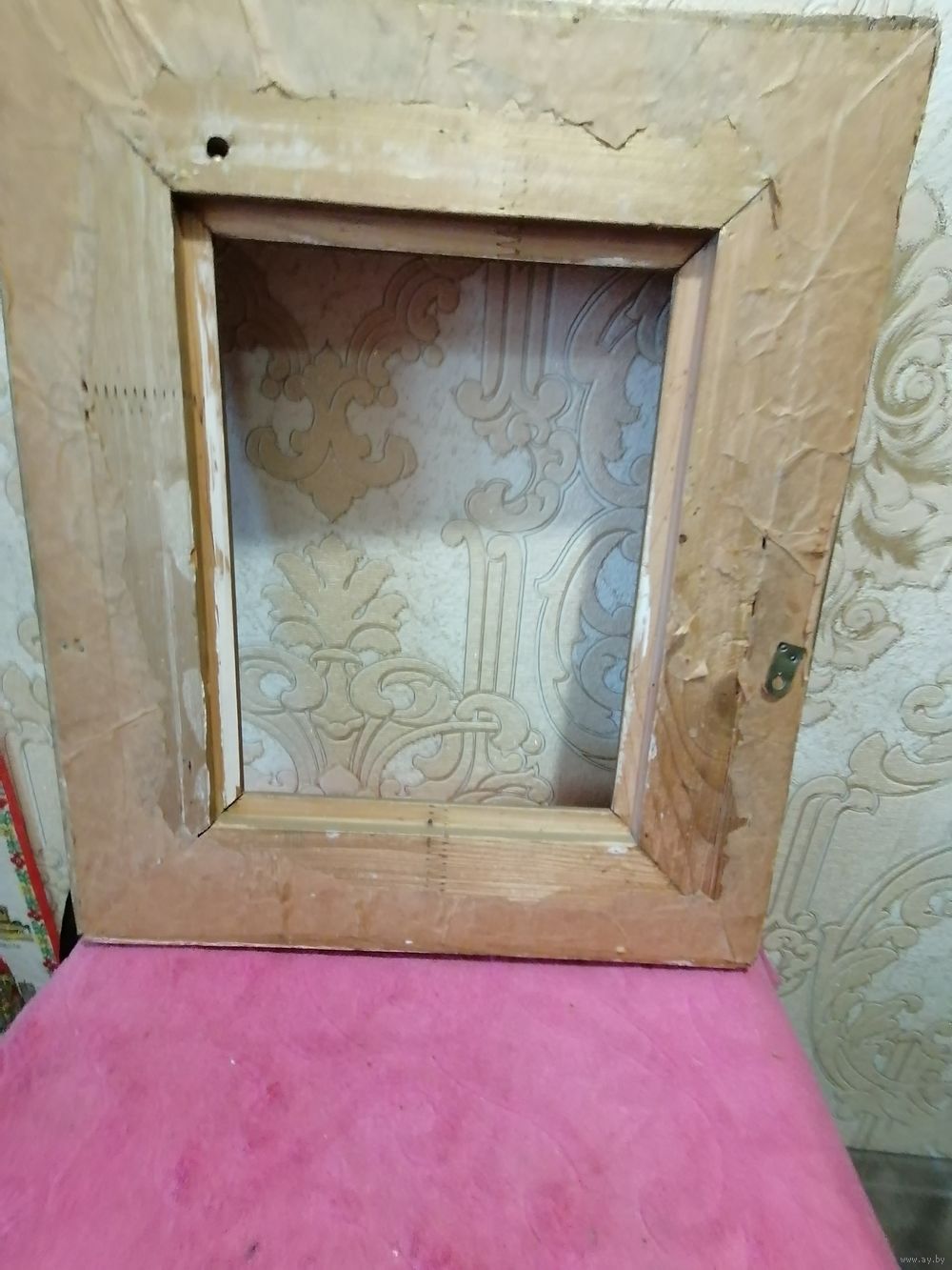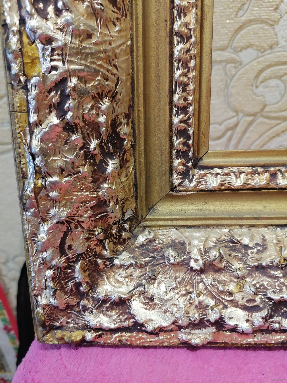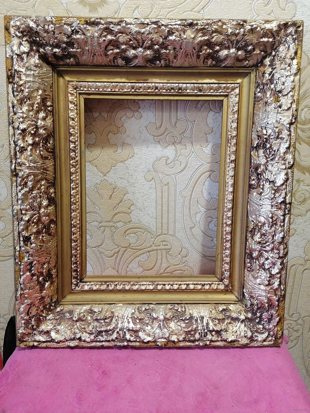 Киот в позолоте и дереве.Разм-39,5х5х34см.внутр-25,5х20см,окно-23,5х18см.Достался более-35лет.назад и ни разу не чистил,если только пыль.Скорей всего покрытие сусальное золото и увесистый.Киот крепкий и без потерь совсем,основа дерево.