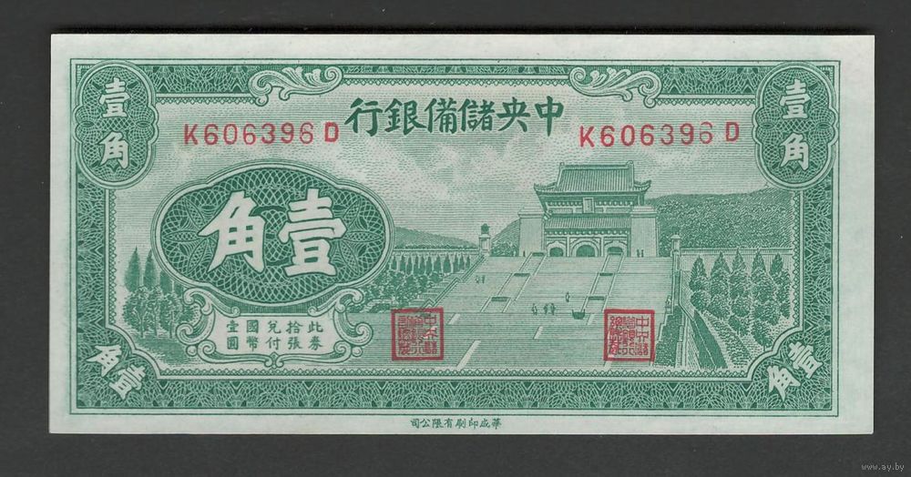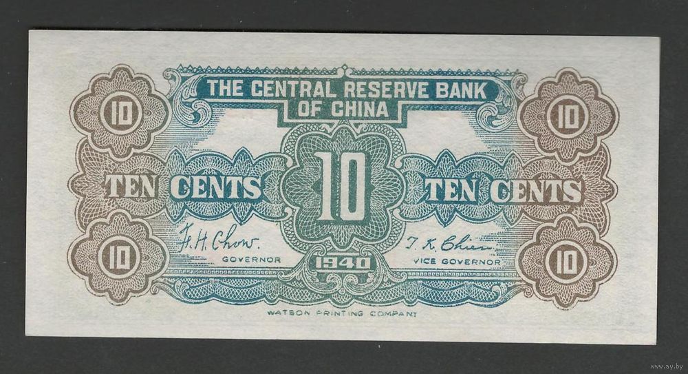 Китай 10 центов 1940 года. Тип P-J3a. Состояние UNC