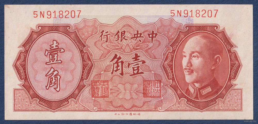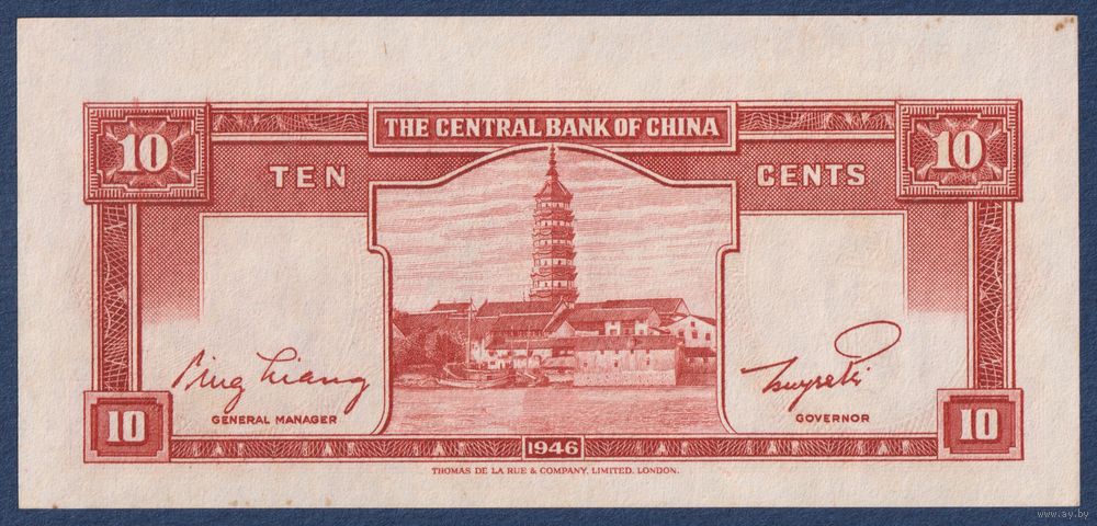 Китай, 10 центов золотом 1946 (1948) г, P-395 (5N, Чан Кайши, пагода), aUNC