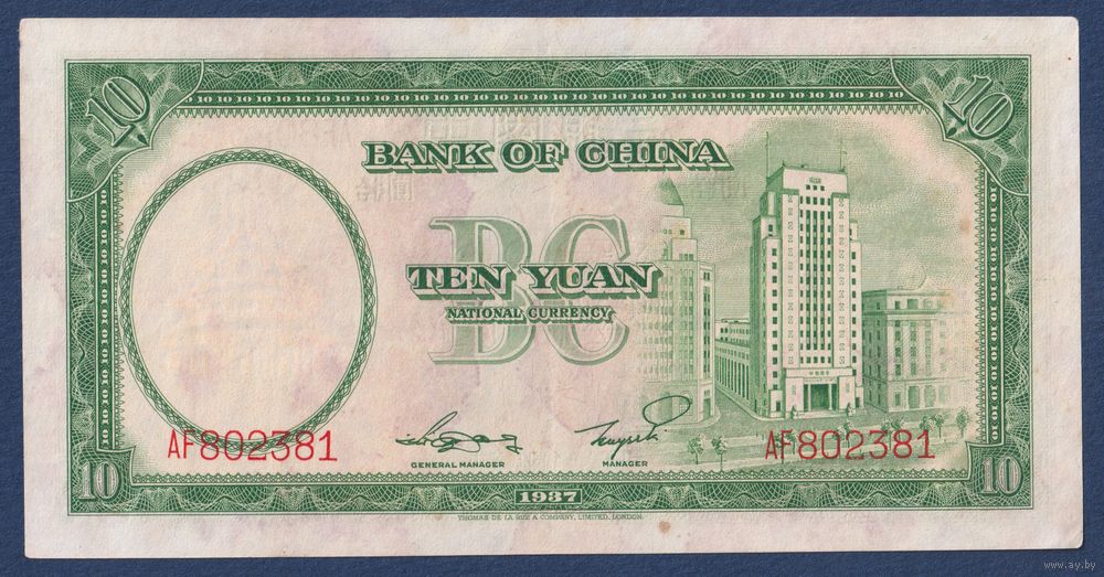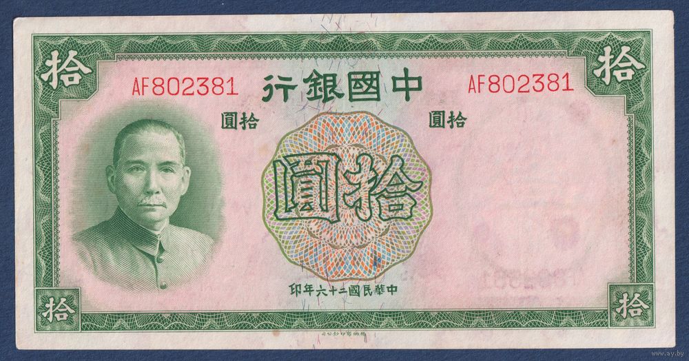 Китай, 10 юаней 1937 г, P-81 (AF, Сунь Ятсен, Банк Китая в Шанхае), VF