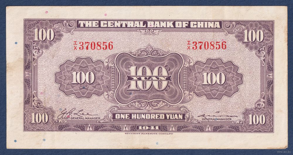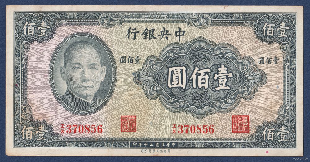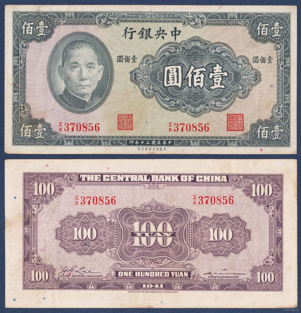 Китай, 100 юаней 1941 г, P-243a (IX, Сунь Ятсен), VF
