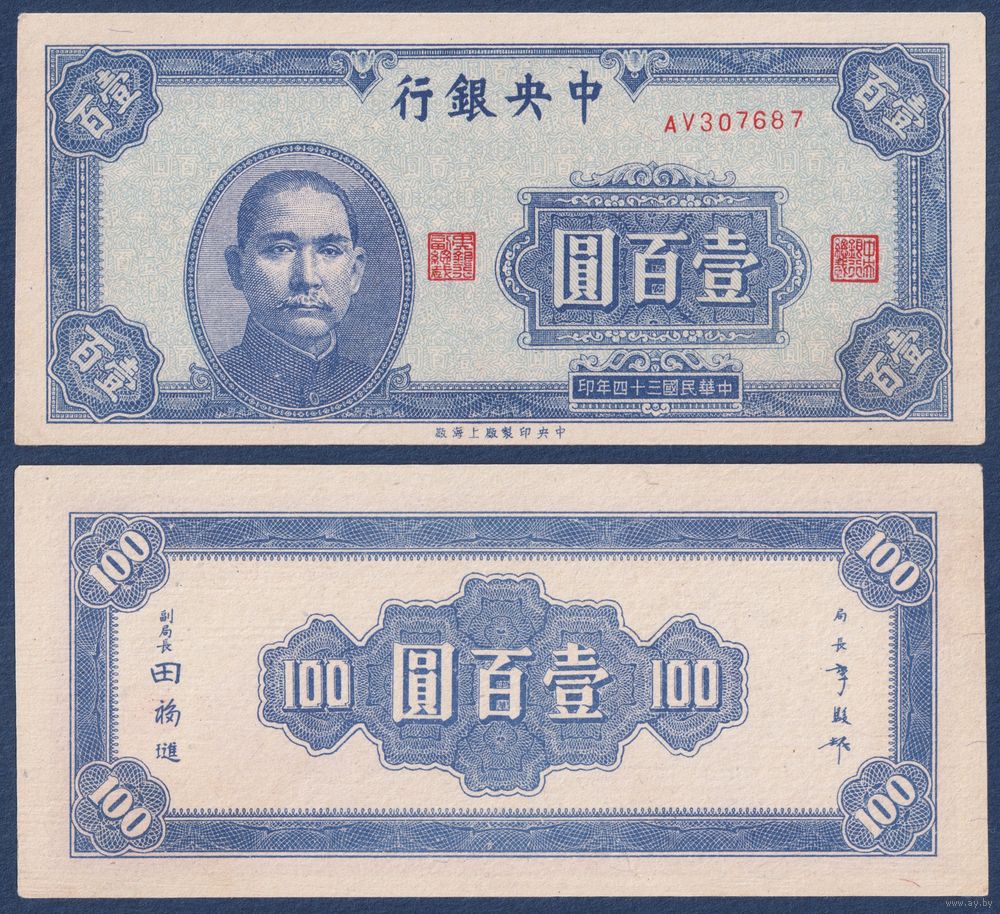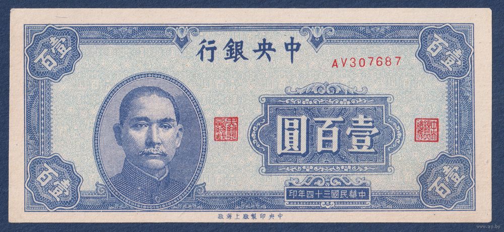 Китай, 100 юаней 1945 г, P-278 (AV, Сунь Ятсен), aUNC-