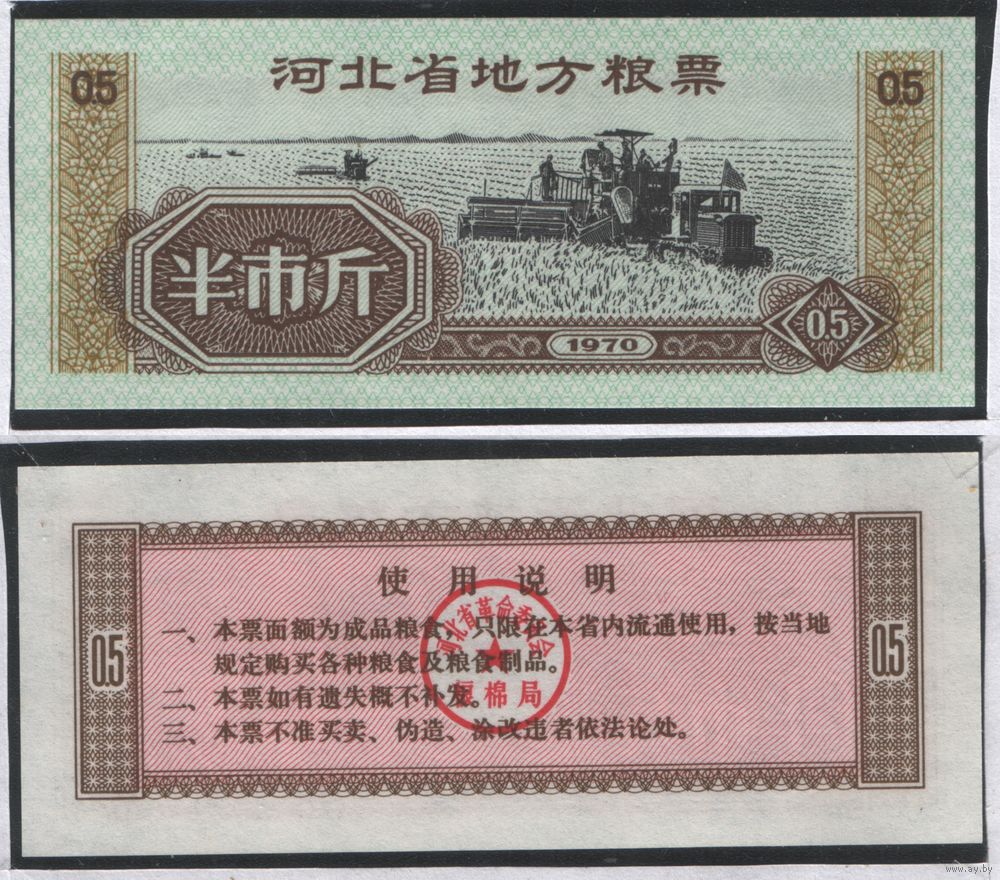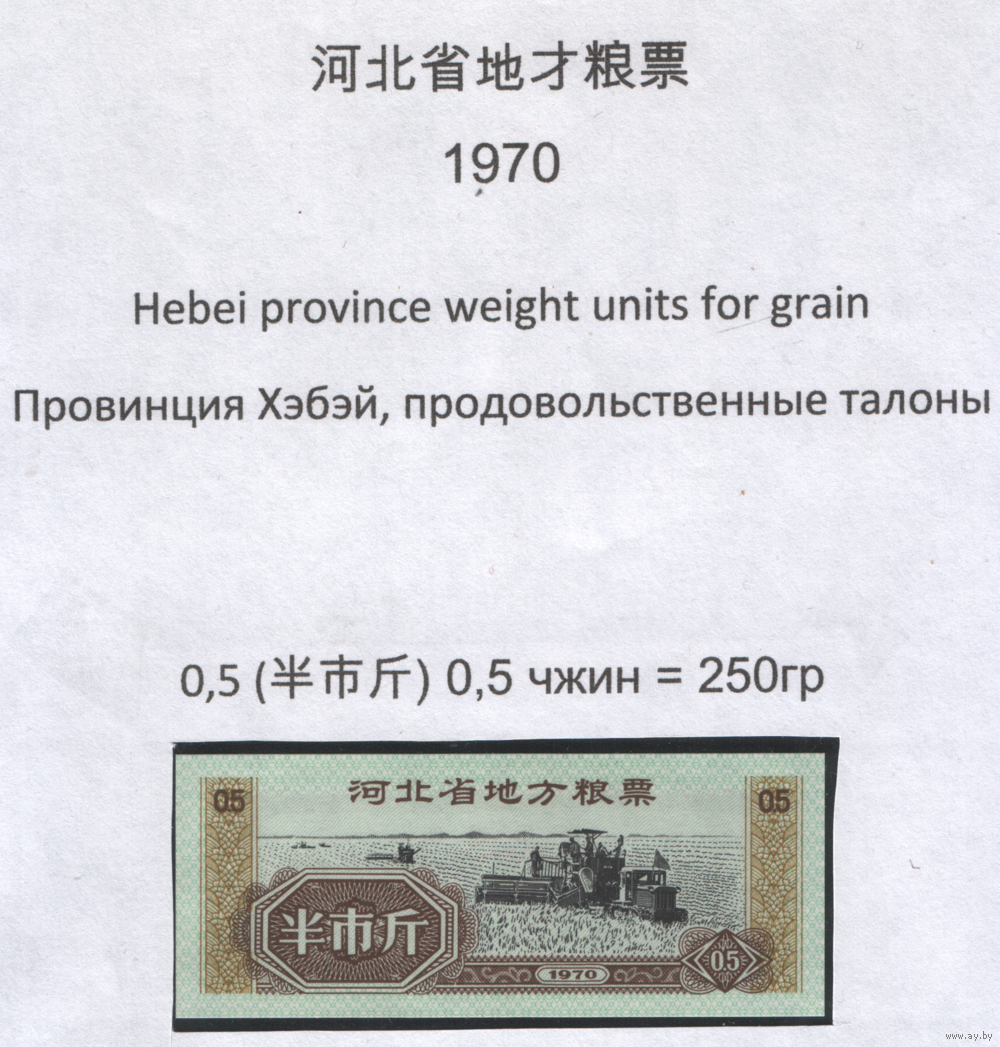 Китай 1970 год Хэбэй провин. прод.талон на 0,5ед=0,5джин=250г (al =