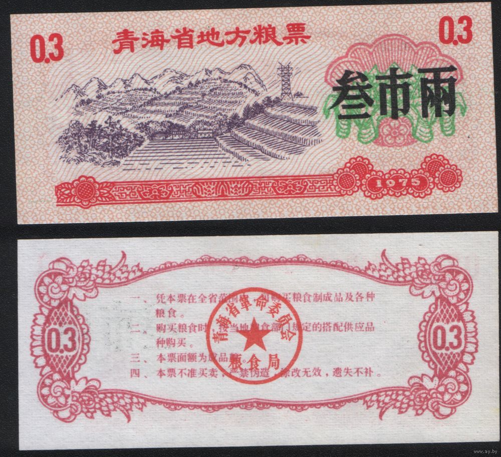 Китай 1975 год Цинхай пров. прод.талон (продовольствие) на 0,3ед=(3лян)=150г(рис) (rd02 =