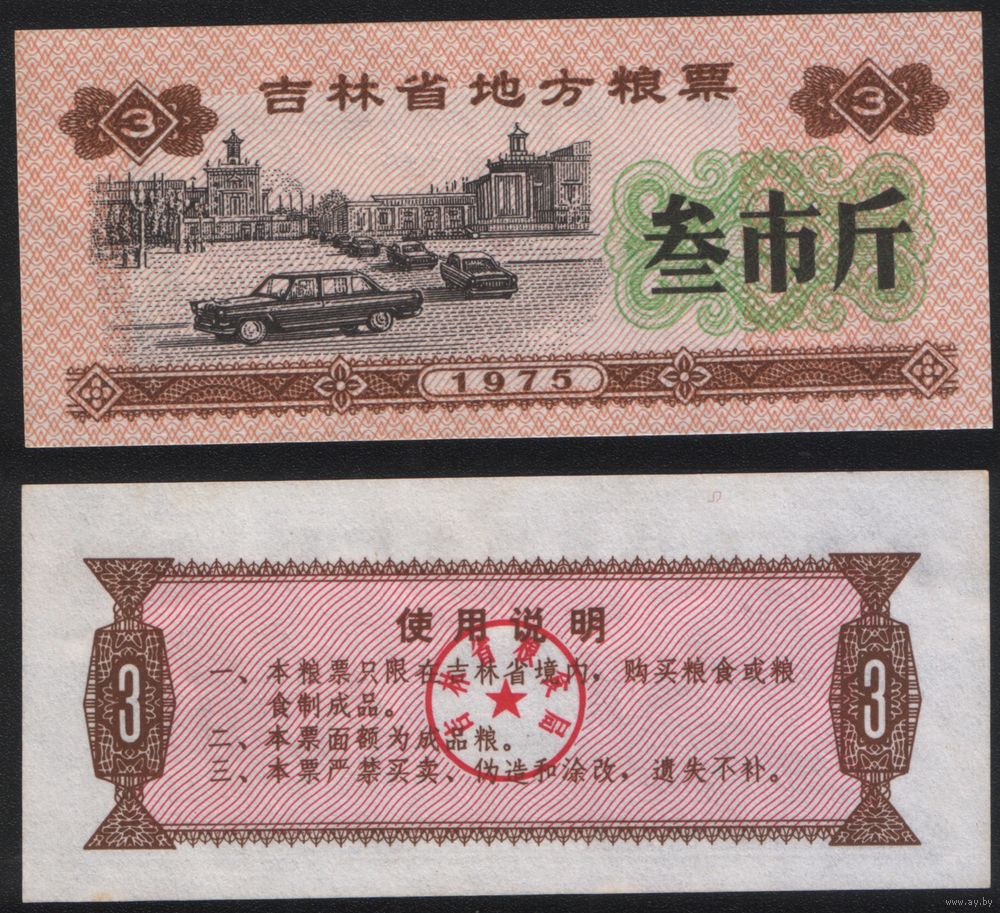 Китай 1975 год Гирин пров. прод.талон (продовольствие) на 3ед=(3чжин)=1,5кг(рис) (rd02 =