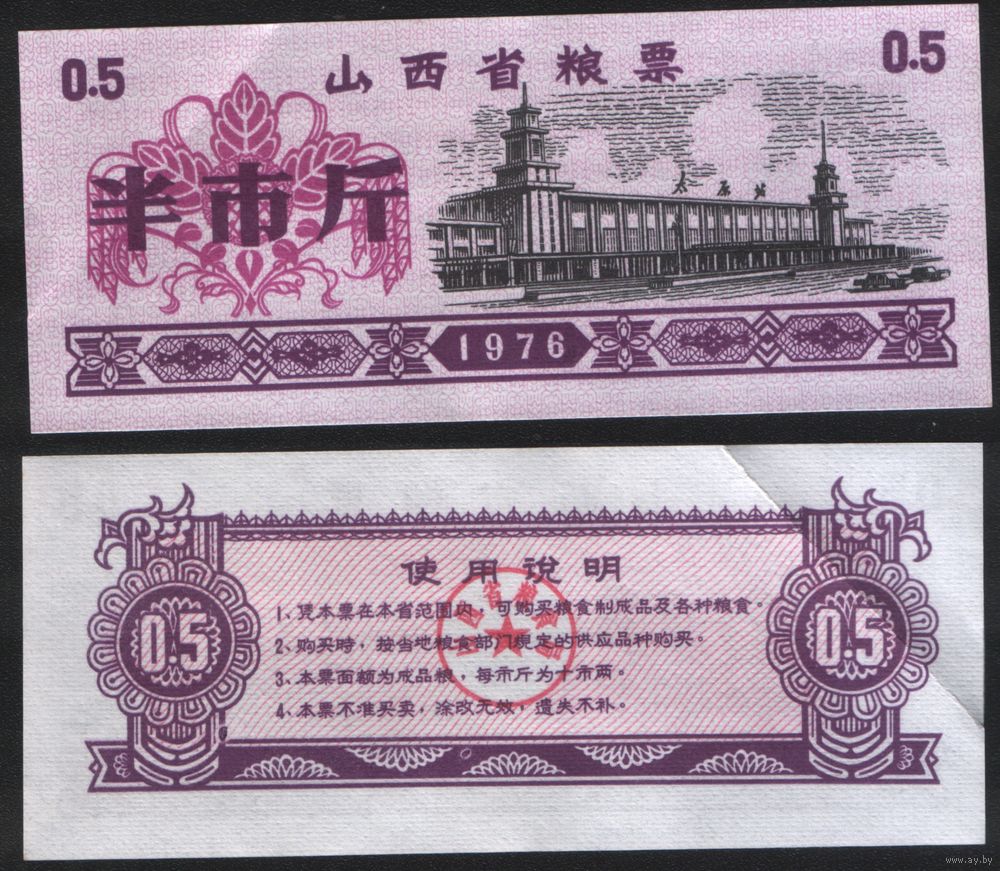 Китай 1976 год Шаньси пров. прод.талон (продовольствие) на 0,5ед=(0,5джин)=250г(рис) (rd02 =